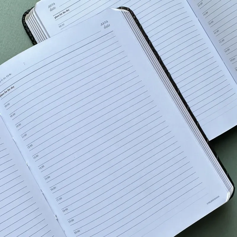 Внутренний блок состоит из 272 страниц белой офсетной бумаги плотностью 70 г/кв.м. и включает 19 страниц для телефонной книги, а также 14 страниц с полезной справочной информацией. Линовка с интервалом в один час позволяет удобно планировать время. Этот стильный и функциональный ежедневник подходит для персонализации, что делает его отличным выбором для корпоративных подарков.