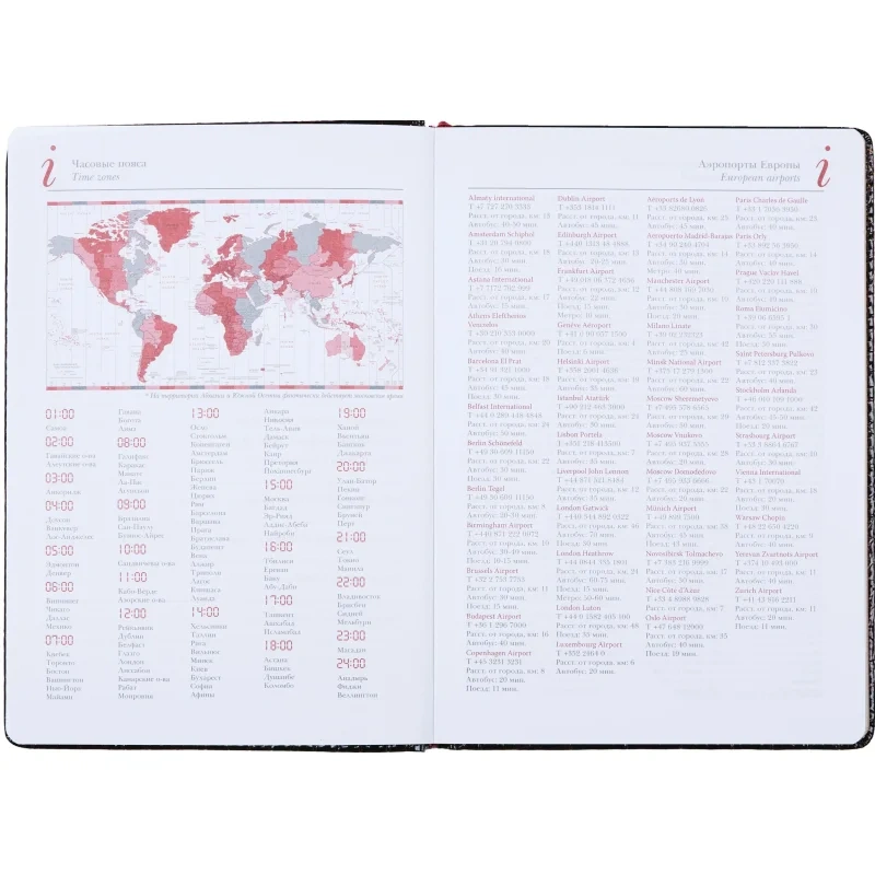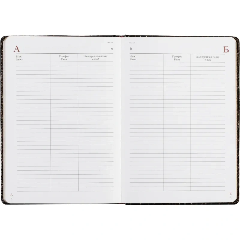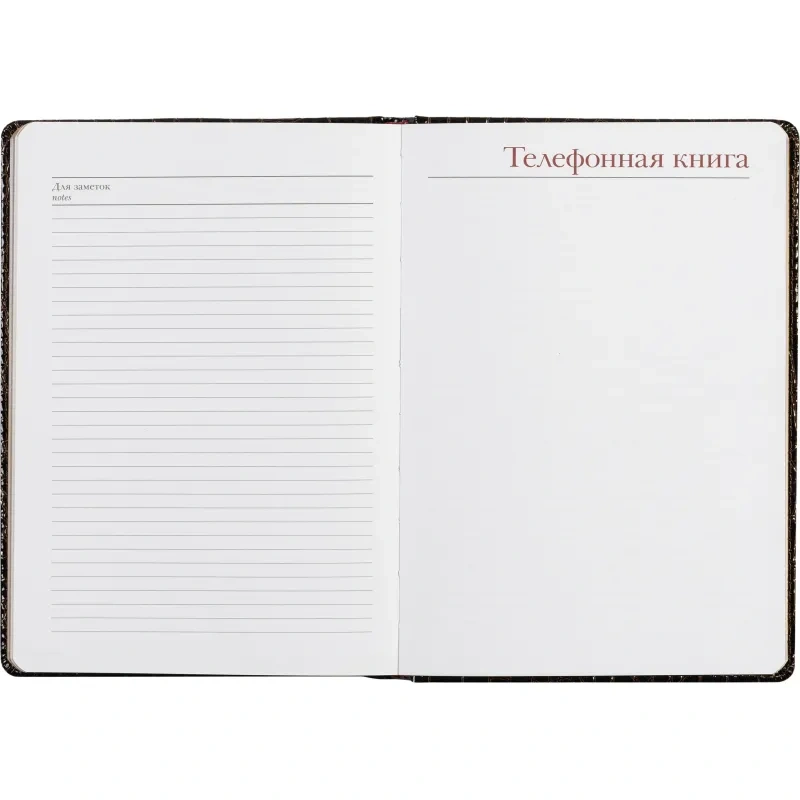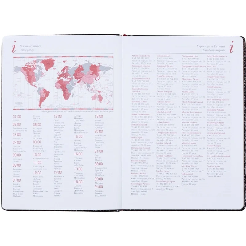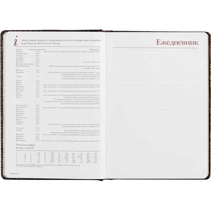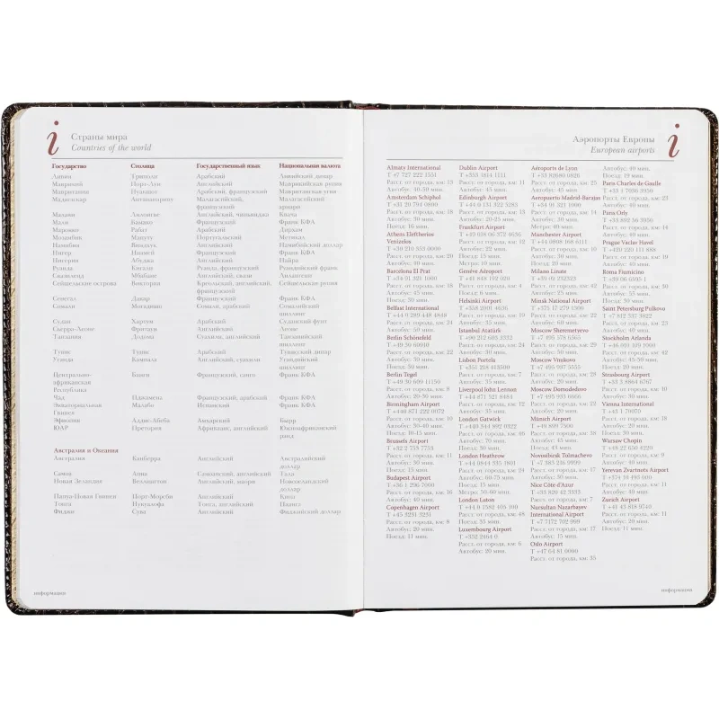 Ежедневник включает полезную справочную информацию на 14 страницах и телефонную книгу на 18 страницах, что делает его функциональным и удобным для использования. Прострочка периметра обложки и возможность тиснения добавляют изделию элегантности.