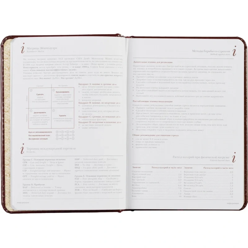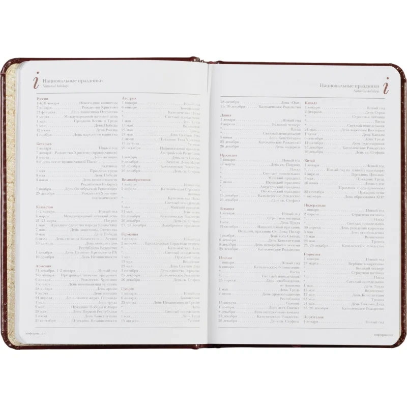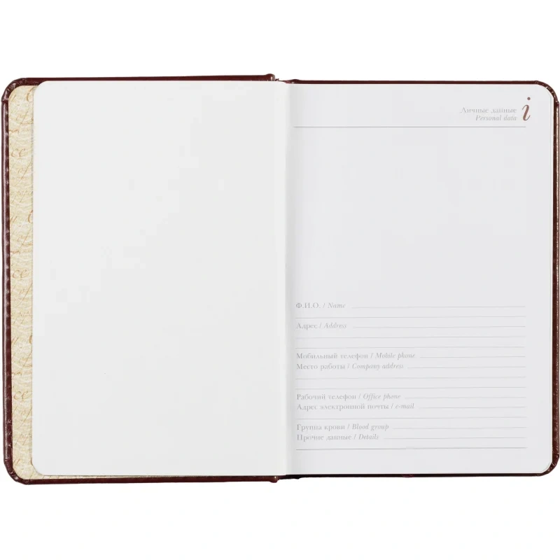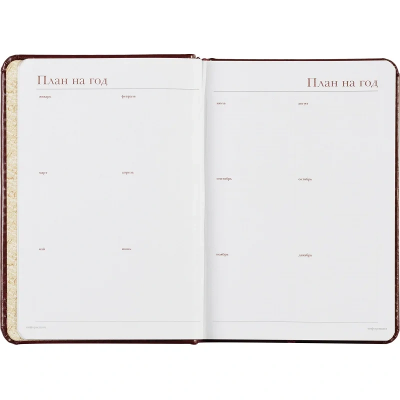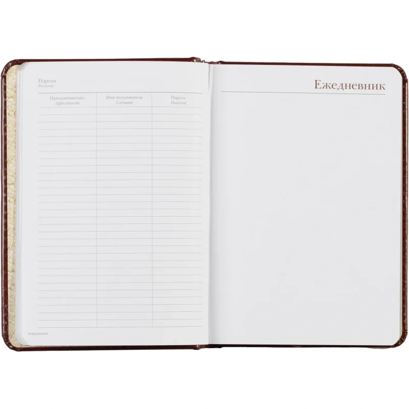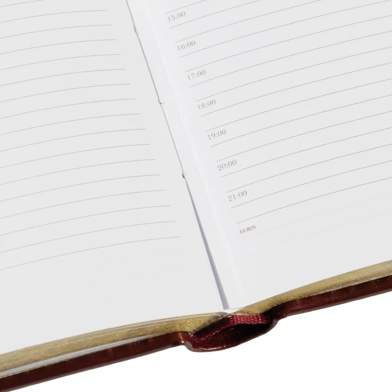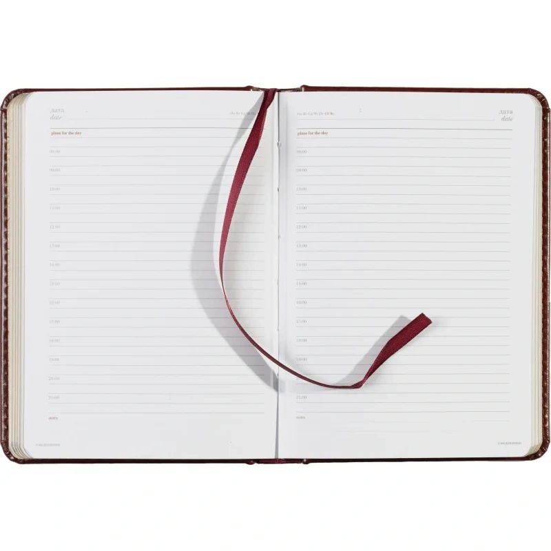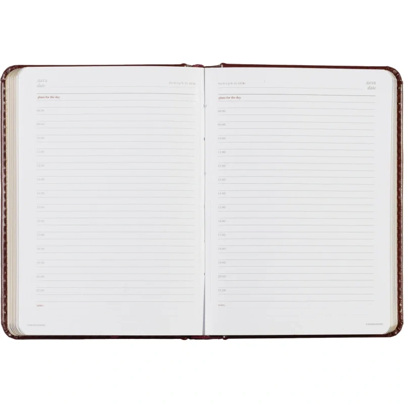 Внутренний блок на 136 страниц состоит из белой офсетной бумаги плотностью 90 г/кв.м. и имеет линейку с указанием времени суток, что позволяет удобно планировать рабочий день. Закладка-ляссе поможет быстро найти последние записи, а золотистый цветной обрез добавляет элегантности.