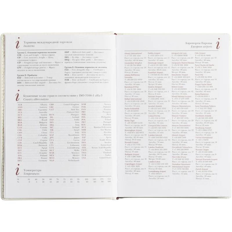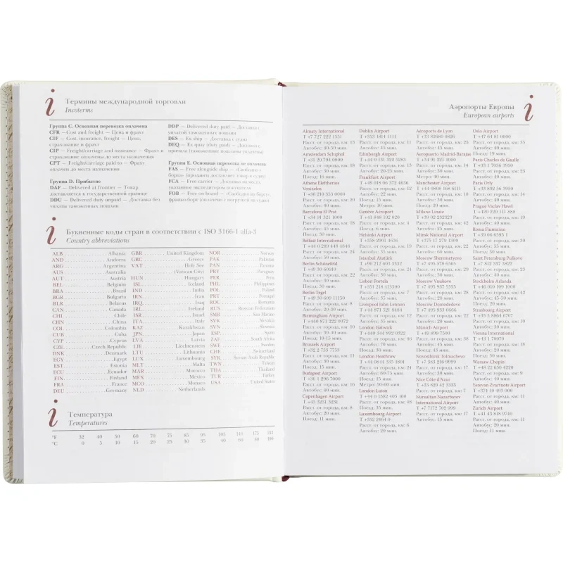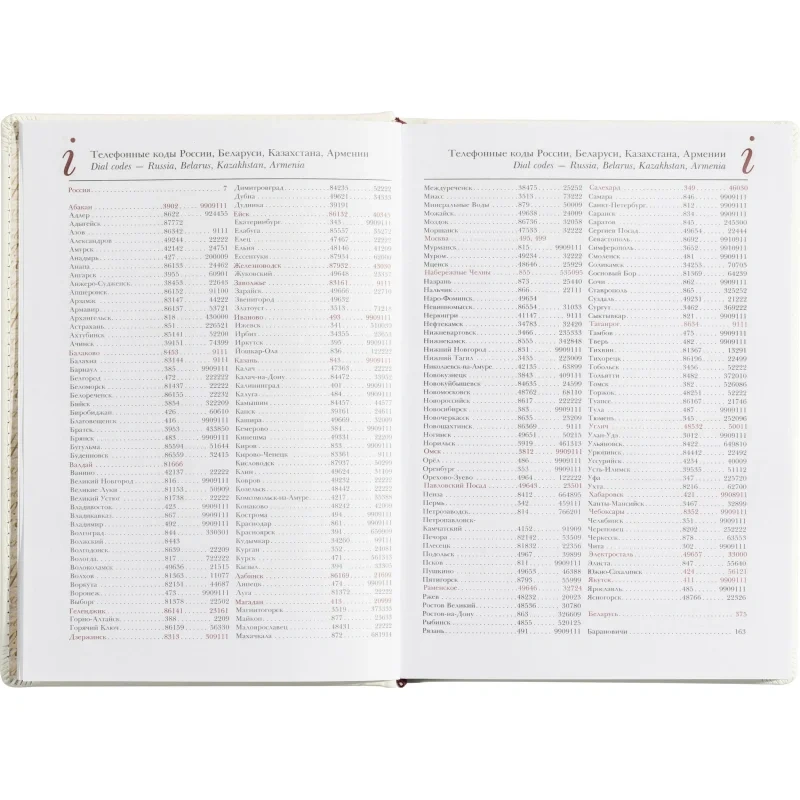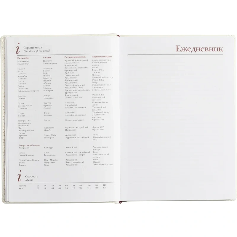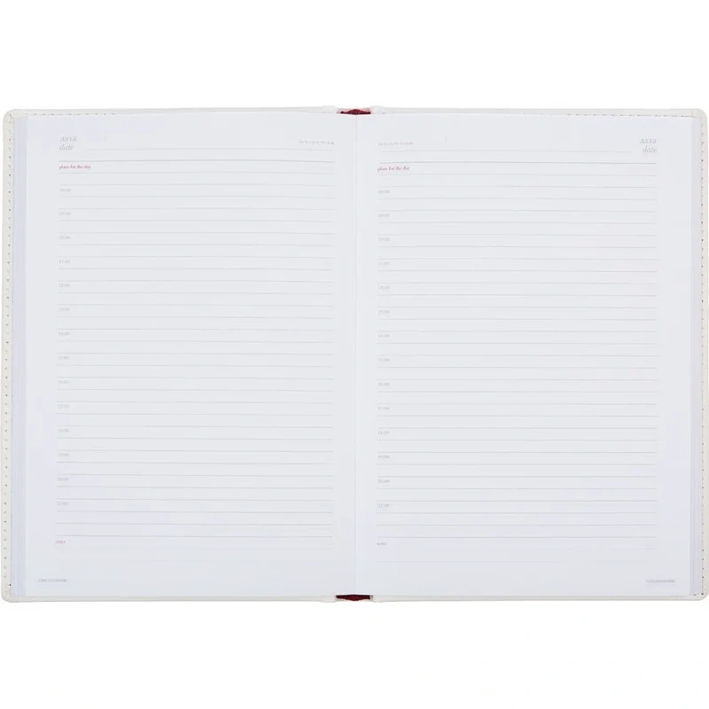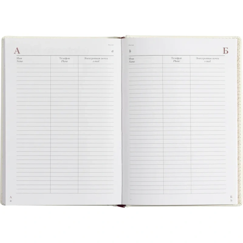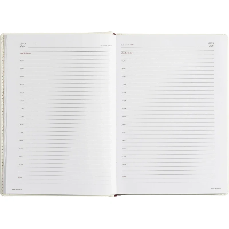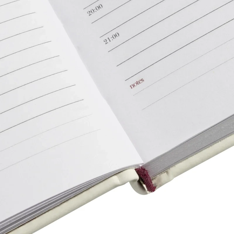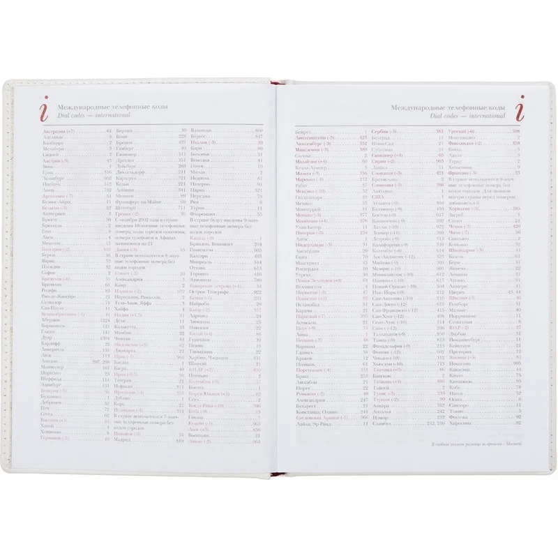 Недатированный блок из белой бумаги содержит 272 страницы в линейку. Рабочие страницы, отпечатанные в две краски, снабжены почасовой разметкой. В справочном разделе на 14 страницаx можно уточнить необxодимую информацию. Телефонная книга (18 страниц) систематизирует Ваши личные и деловые контакты. Ляссе, подобранное в тон капталу, сделано из бордового шелка.