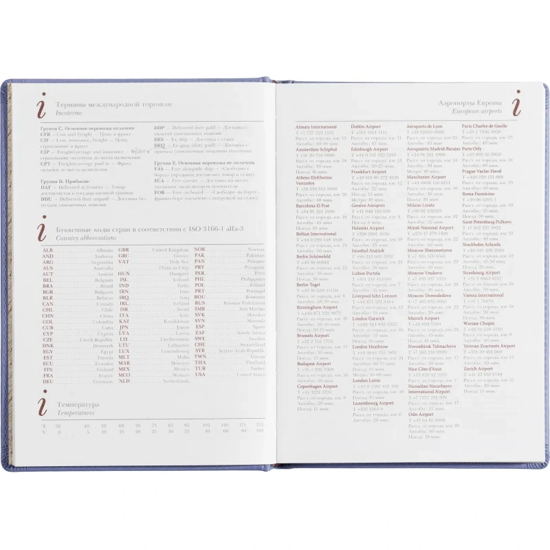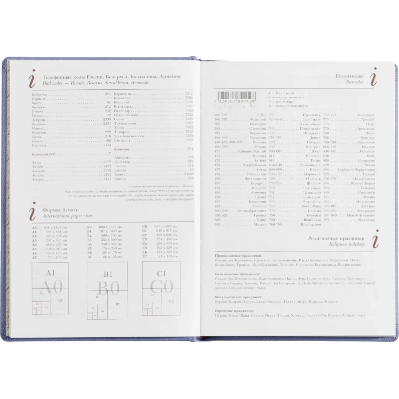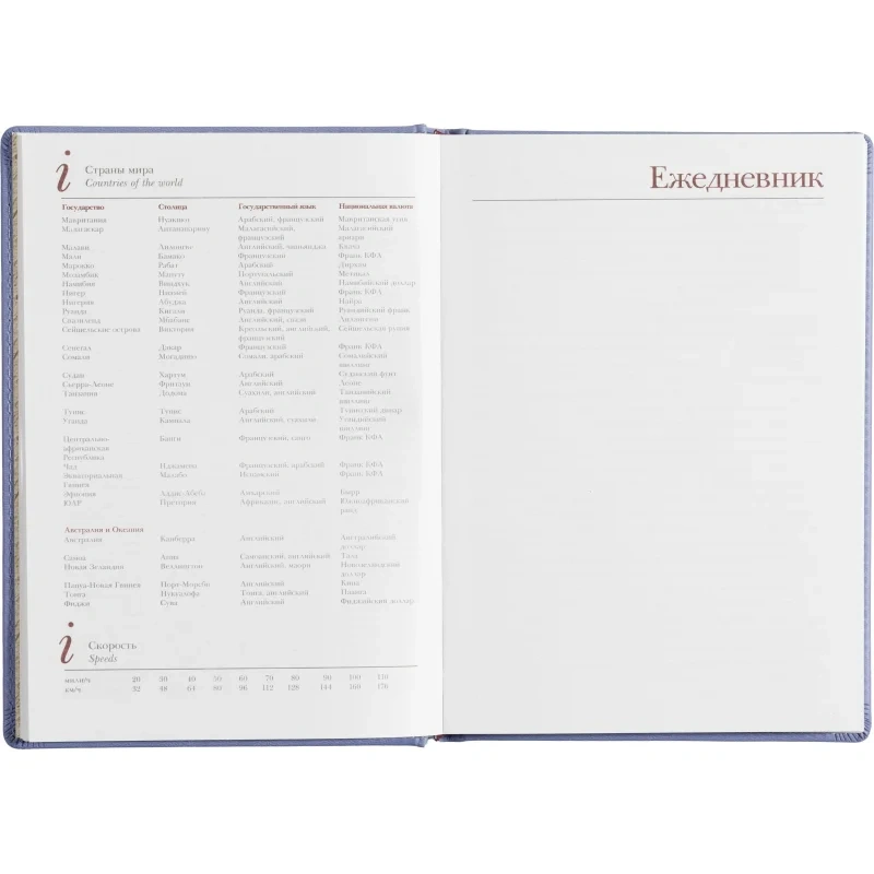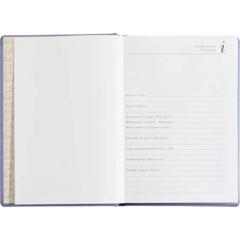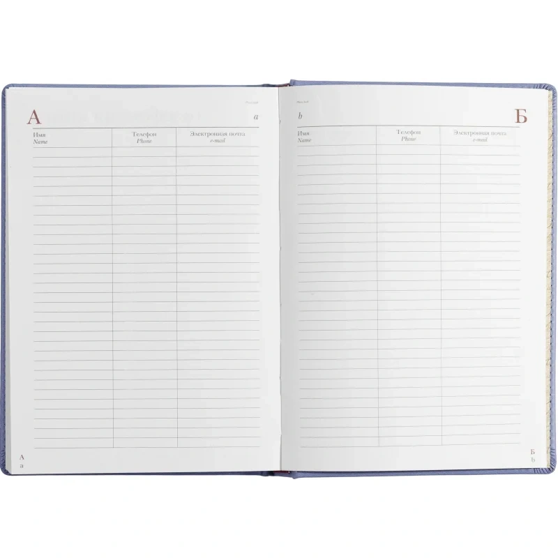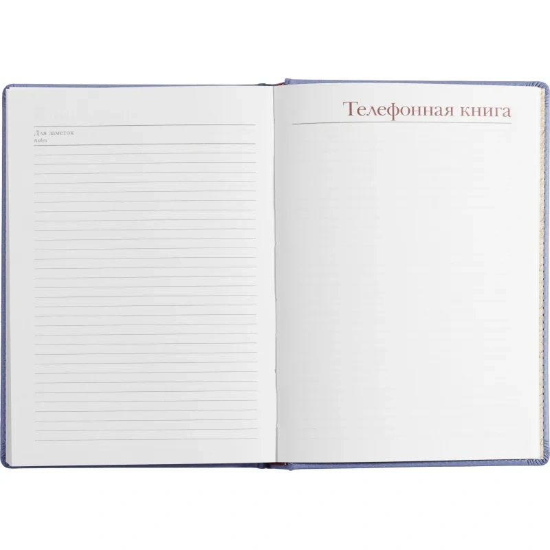 Недатированный, в линейку, 272 страницы, печать в два цвета, угол cкругленный, размер 145?205 мм. Обложка — кожзаменитель с рельефом, прострочена по периметру.