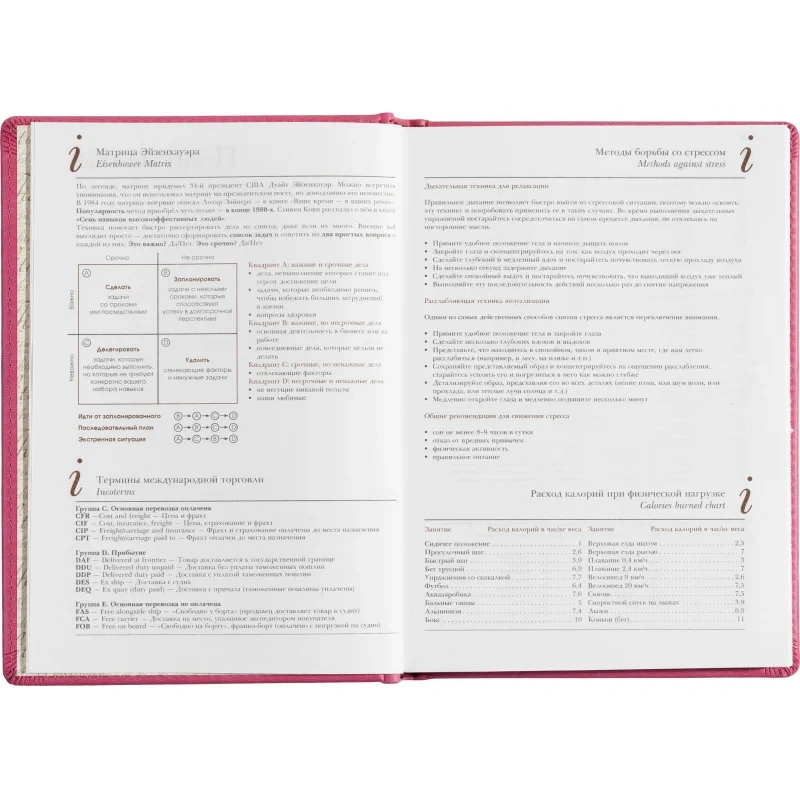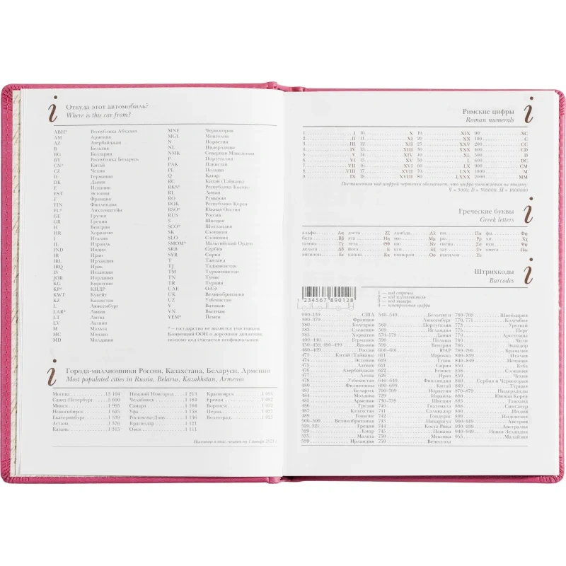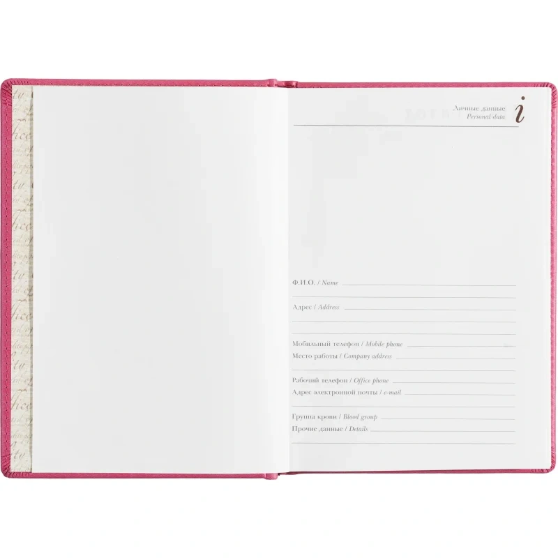 Недатированный, в линейку, 272 страницы, печать в два цвета, угол cкругленный, размер 145?205 мм. Обложка — кожзаменитель с рельефом, прострочена по периметру.
