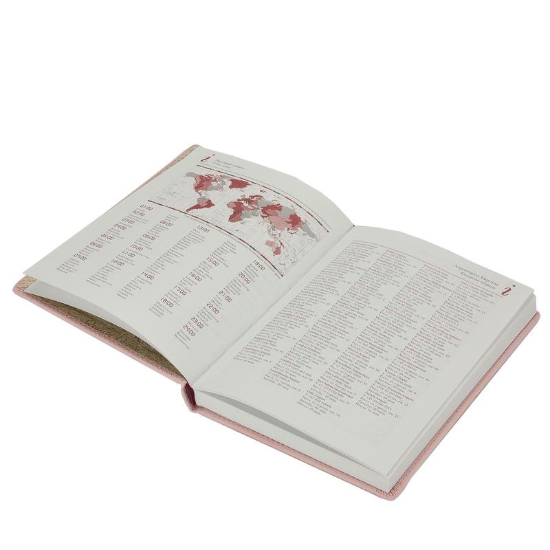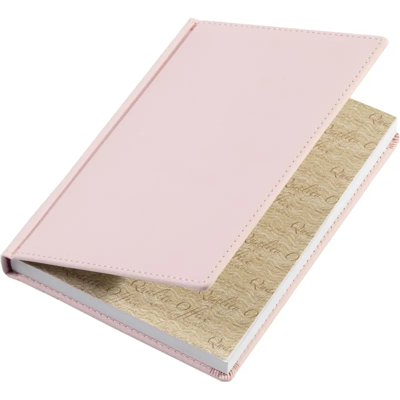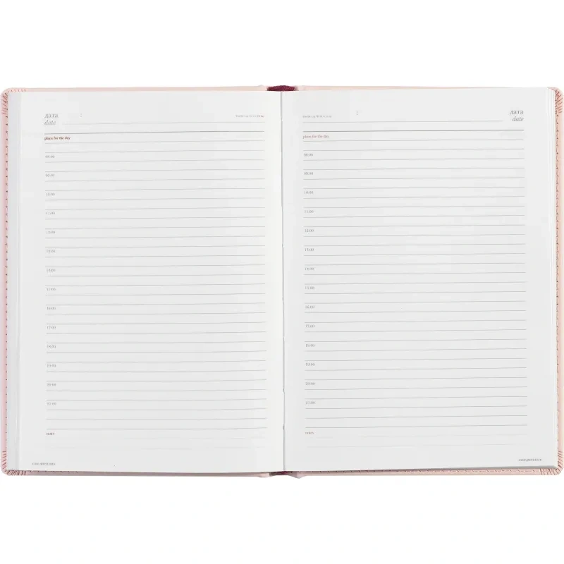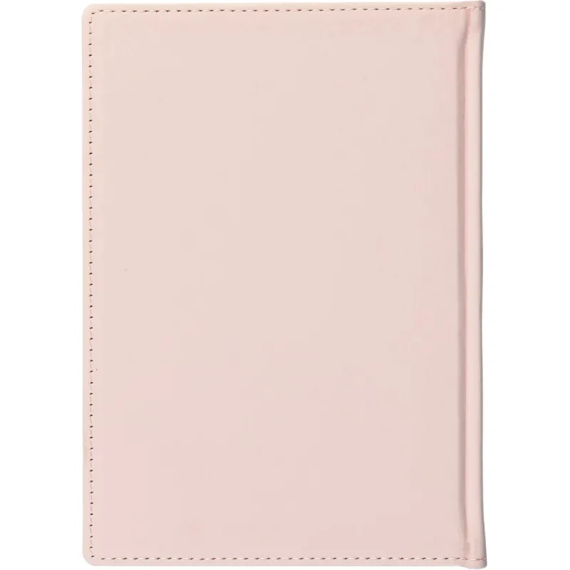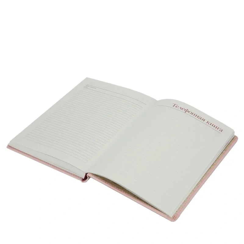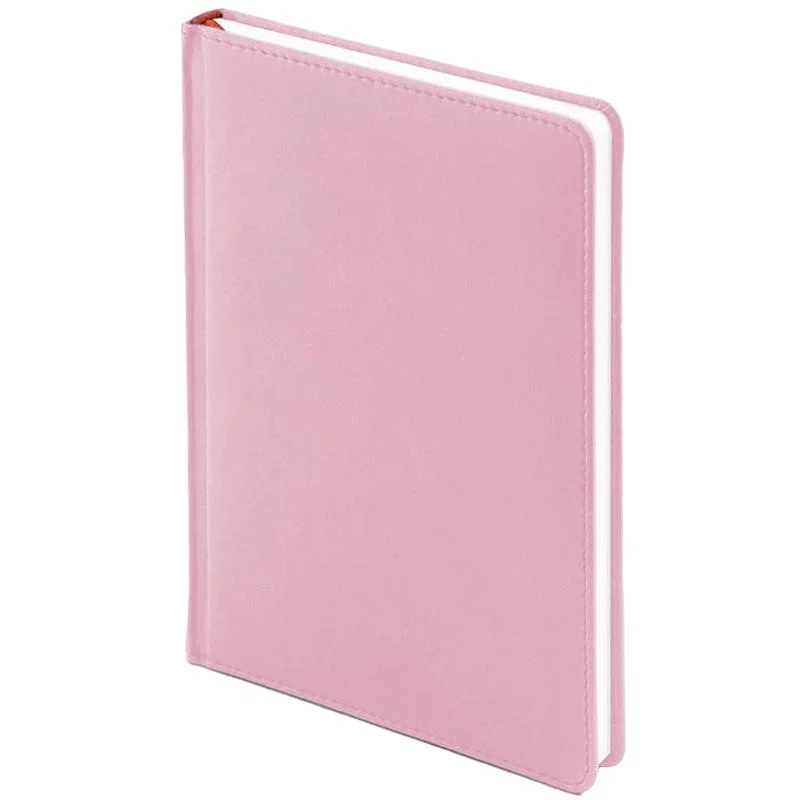 Ежедневник формата A5+ с твёрдой обложкой розового цвета, выполненной из материала, имитирующего кожу, станет стильным и функциональным аксессуаром для ежедневных записей. Внутренний блок состоит из 136 листов (272 страницы) белой офсетной бумаги плотностью 90 г/кв.м. с линейкой. Печать выполнена в два цвета.
