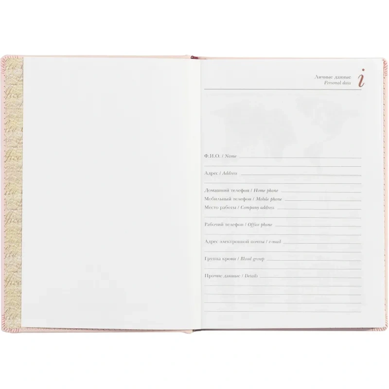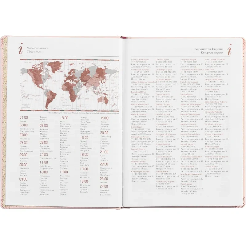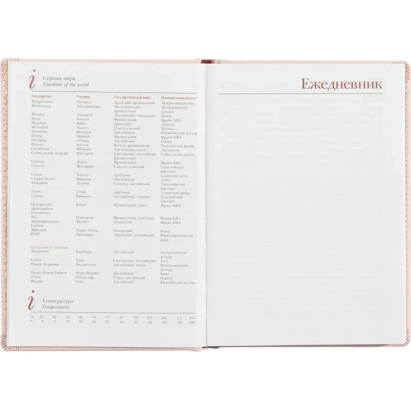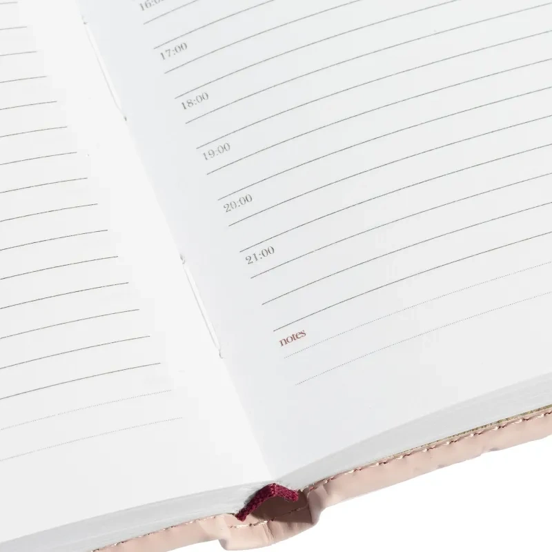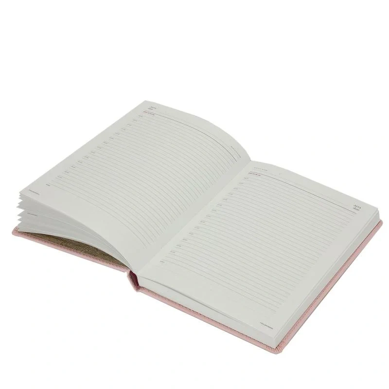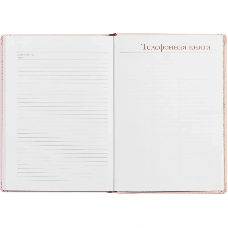 Ежедневник формата A5+ с твёрдой обложкой розового цвета, выполненной из материала, имитирующего кожу, станет стильным и функциональным аксессуаром для ежедневных записей. Внутренний блок состоит из 136 листов (272 страницы) белой офсетной бумаги плотностью 90 г/кв.м. с линейкой. Печать выполнена в два цвета.