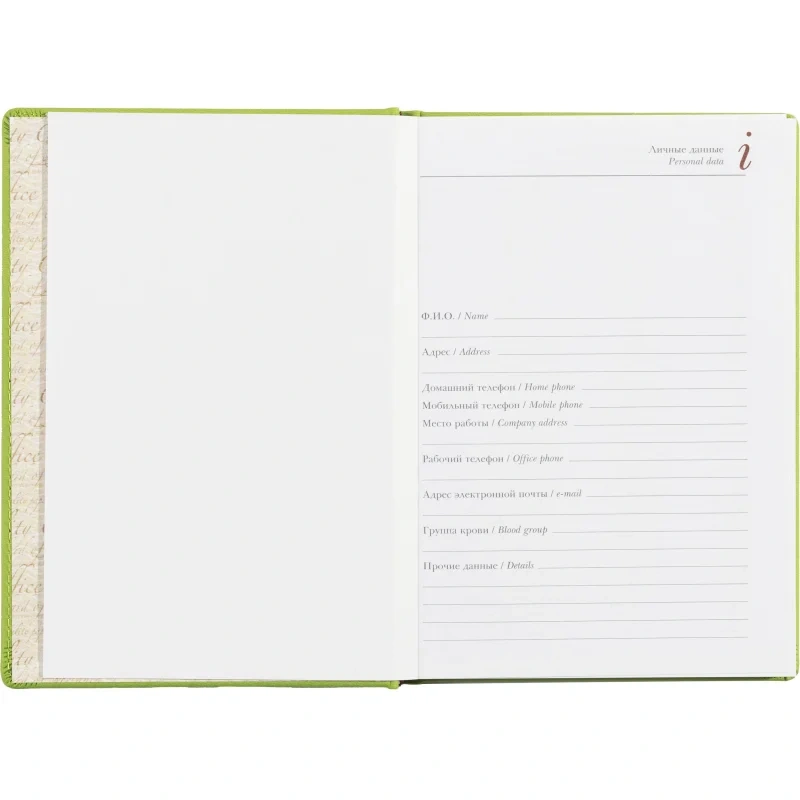 Недатированный, в линейку, 272 страницы, печать в два цвета, угол cкругленный, размер 145?205 мм. Обложка — кожзаменитель с рельефом, прострочена по периметру.