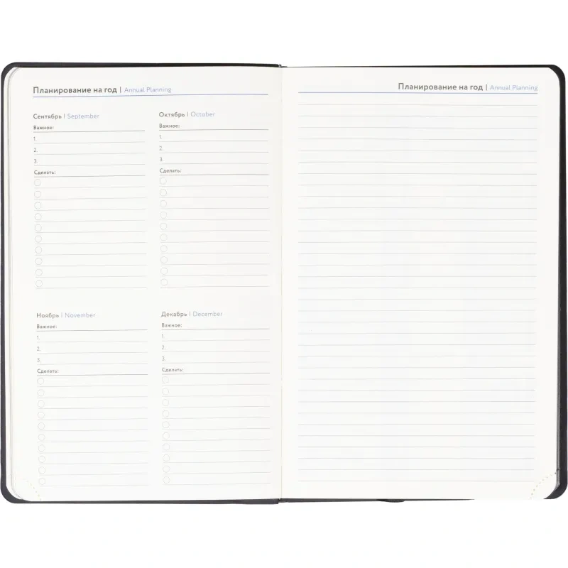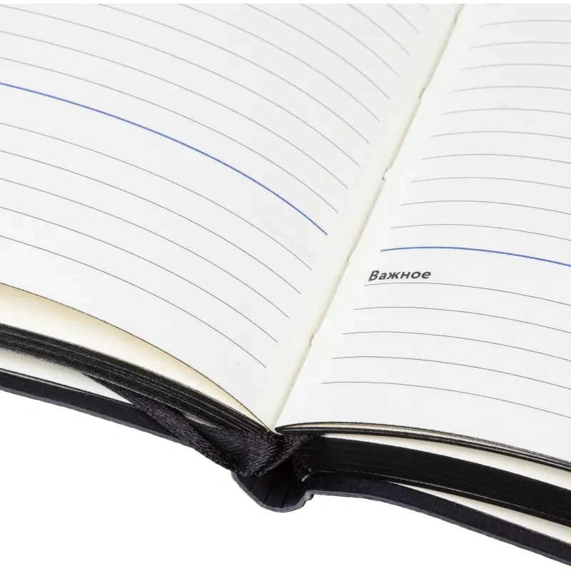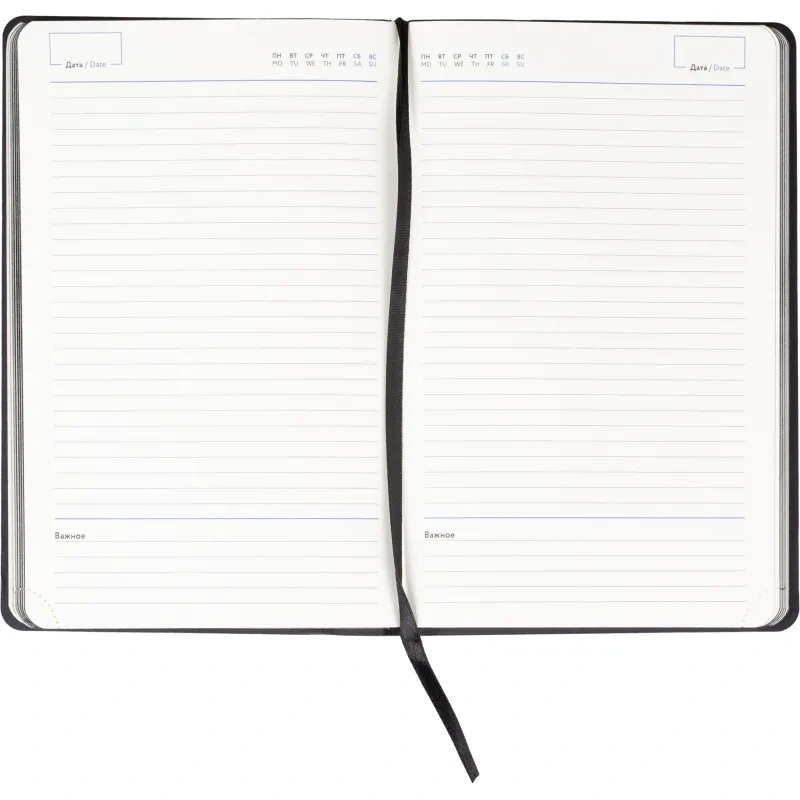 Ежедневник формата A5 предназначен для записи задач, планов и заметок без привязки к датам. Обложка выполнена из искусственной кожи чёрного цвета с тиснением и оформлена в однотонном стиле. Мягкий переплёт делает изделие удобным для повседневного использования, а сшивка блока обеспечивает его надёжность.