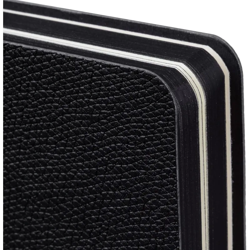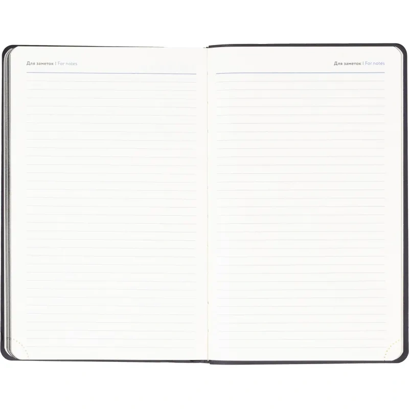 Внутренний блок включает 160 листов тонированной офсетной бумаги плотностью 80 г/кв.м. Страницы размечены в линейку и напечатаны в две краски. Перфорация уголков и вырубка блока упрощают поиск нужной страницы. Скруглённые углы листов делают перелистывание более комфортным. Чёрный обрез подчёркивает строгий и аккуратный внешний вид изделия.