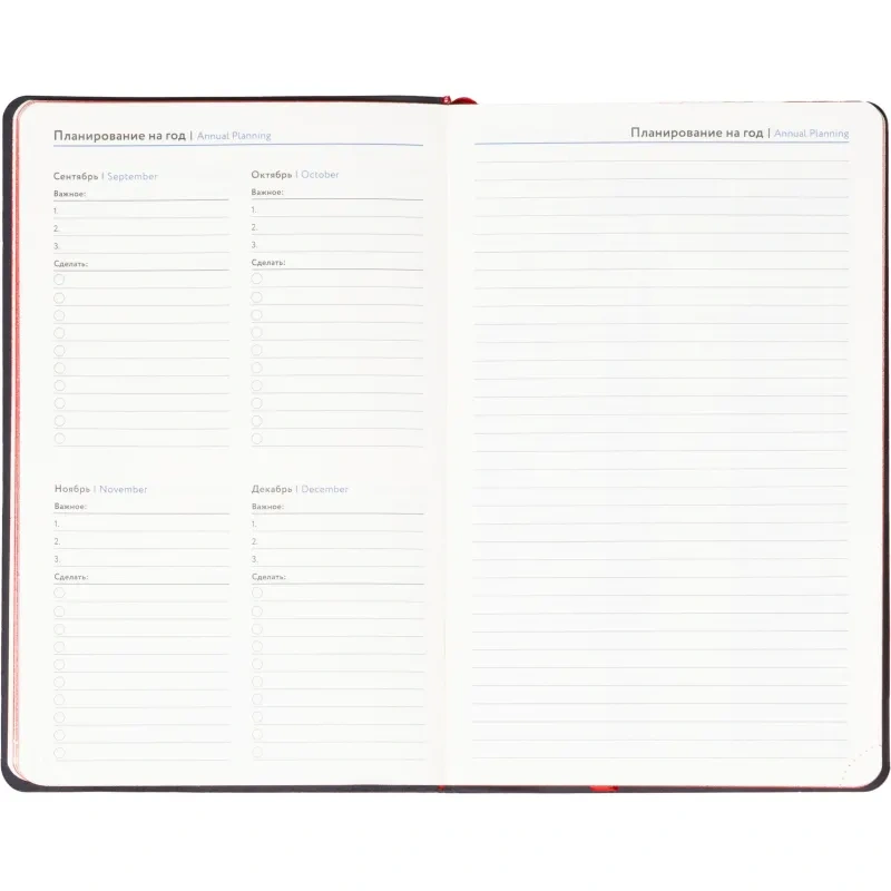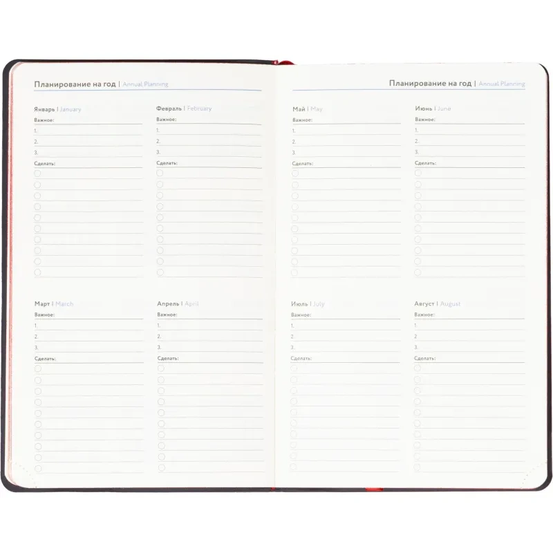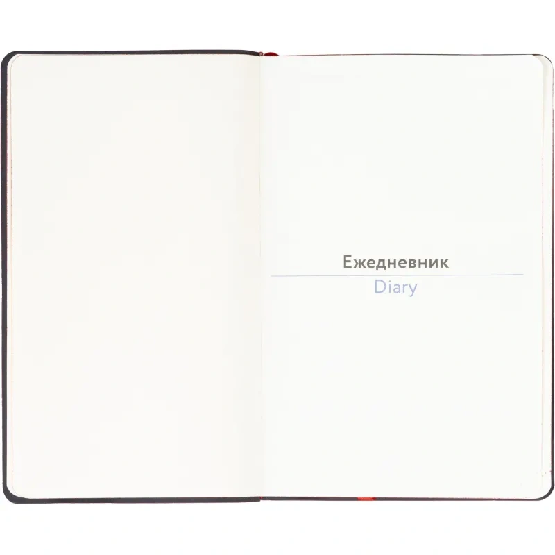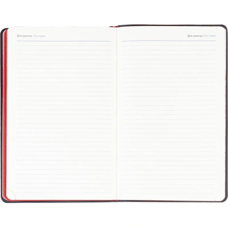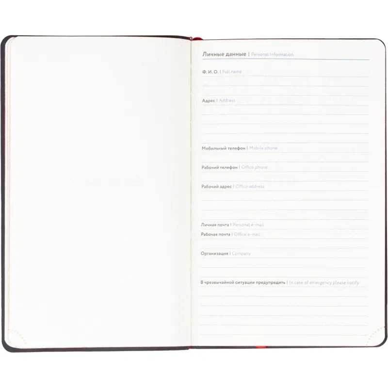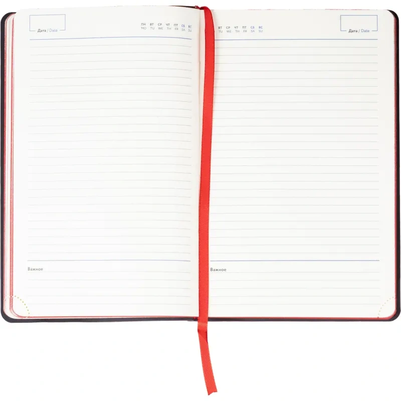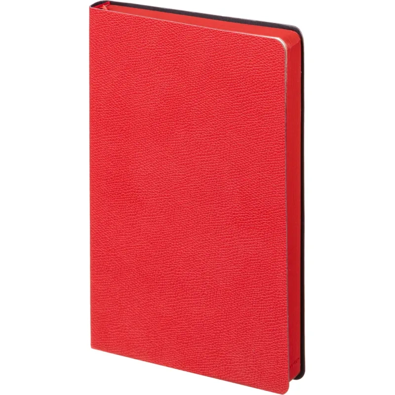 Ежедневник формата A5 предназначен для ведения записей без привязки к датам. Обложка выполнена из искусственной кожи красного цвета с тиснением и оформлена в однотонном стиле. Мягкий переплёт делает изделие гибким и лёгким, а сшивка внутреннего блока обеспечивает его прочность при регулярном использовании.
