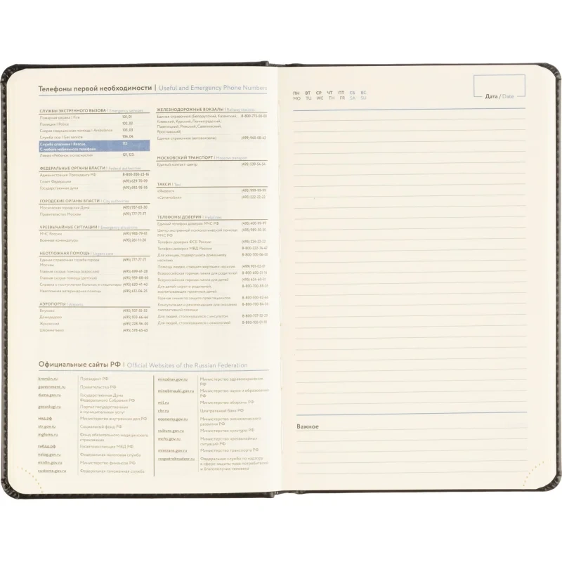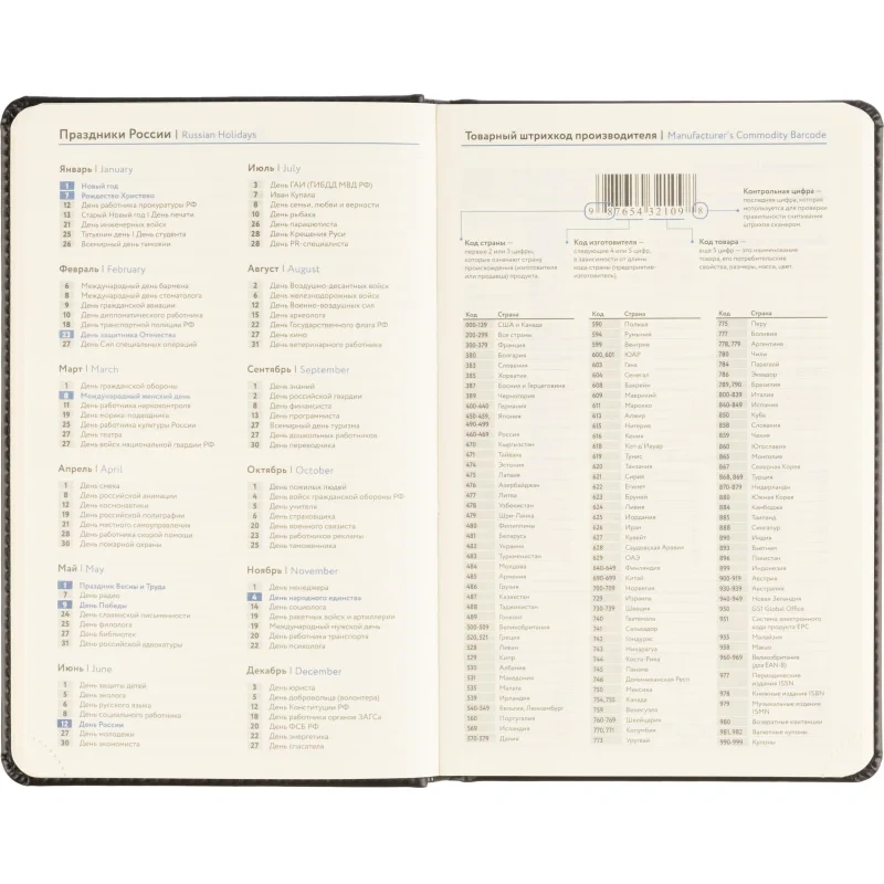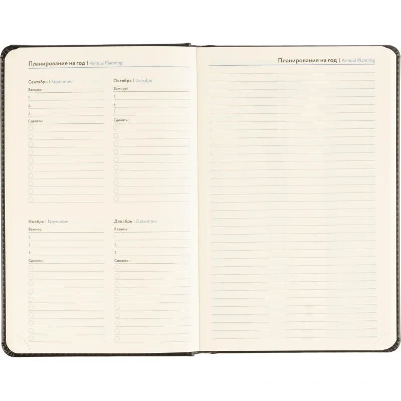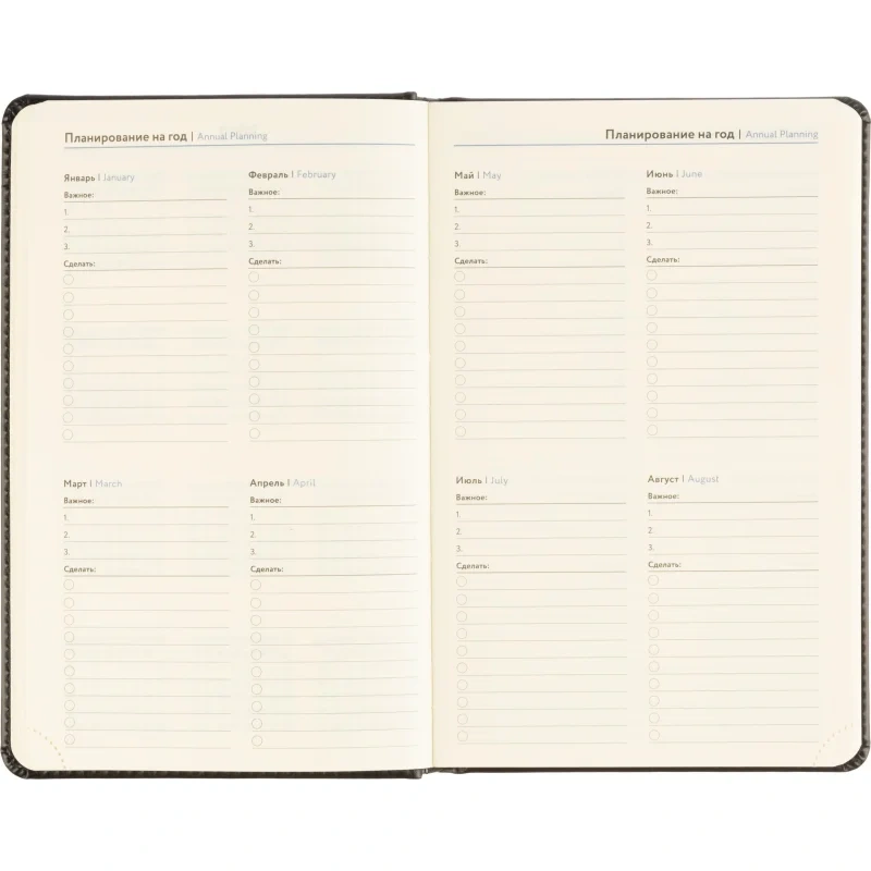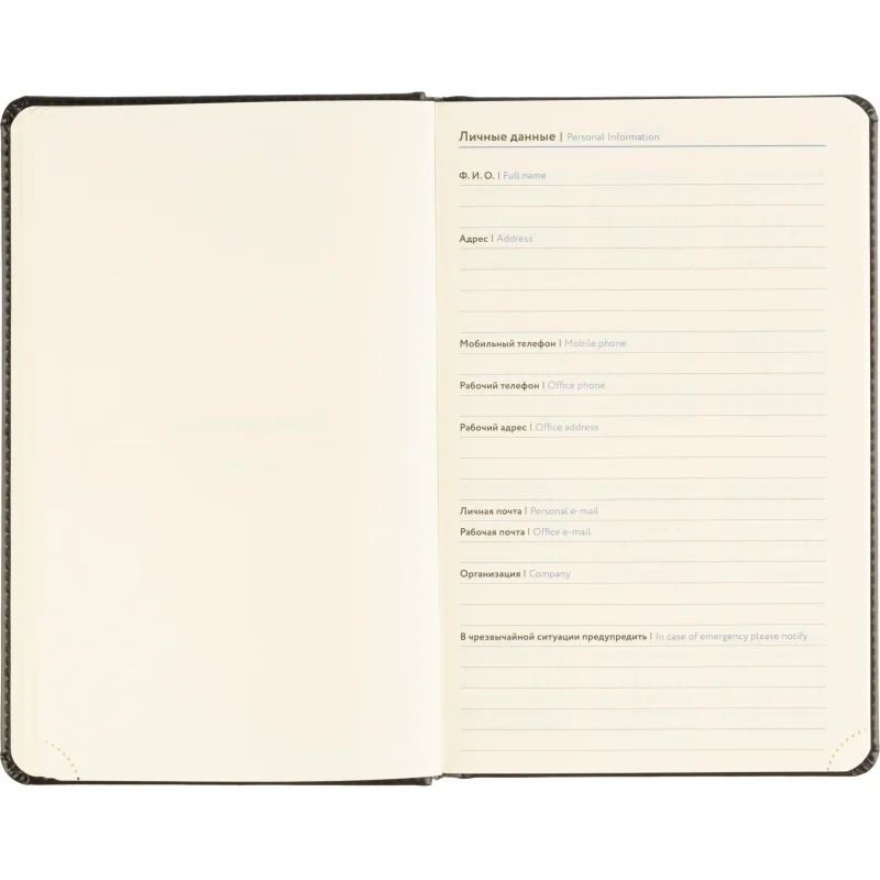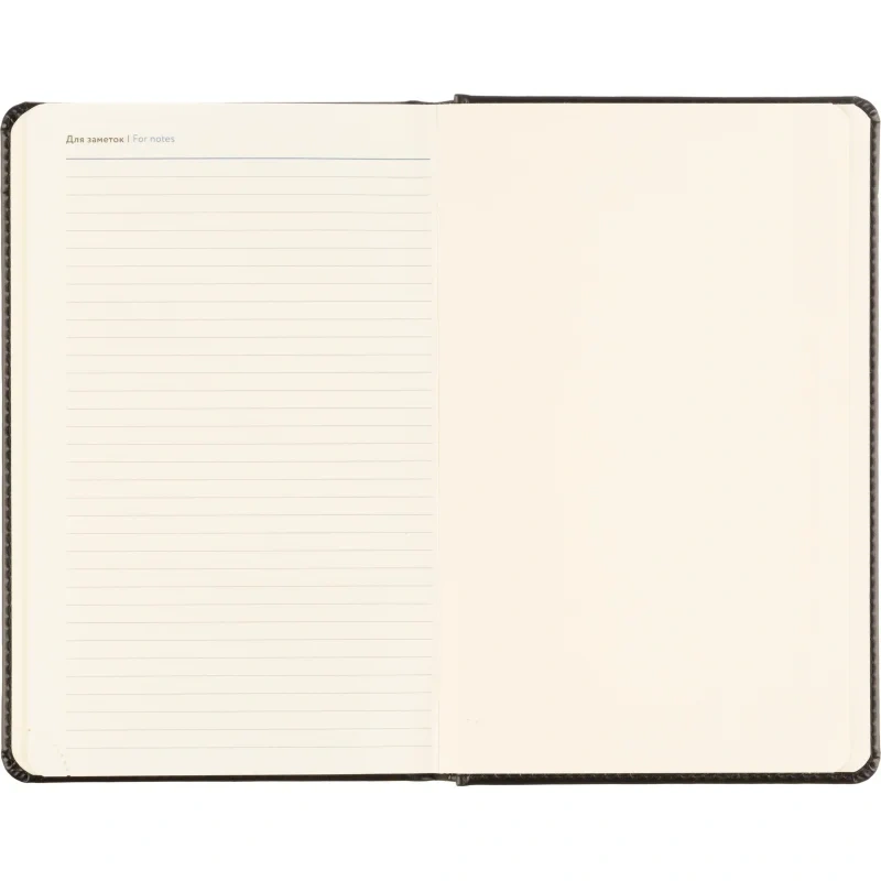 Обложка выполнена из чёрной искусственной кожи, оформлена тиснением и дополнена прочной прострочкой по периметру. Твёрдый переплёт и сшивка гарантируют износостойкость. Скруглённые углы, вырубка и перфорация уголков делают использование комфортным. Ежедневник оснащён ляссе и календарём на два года. Подходит под персонализацию.