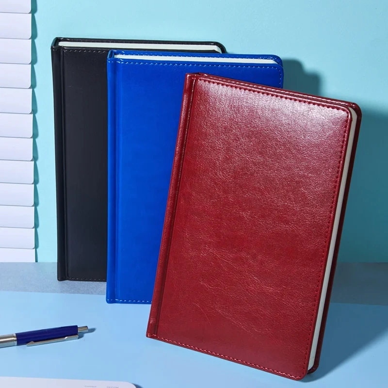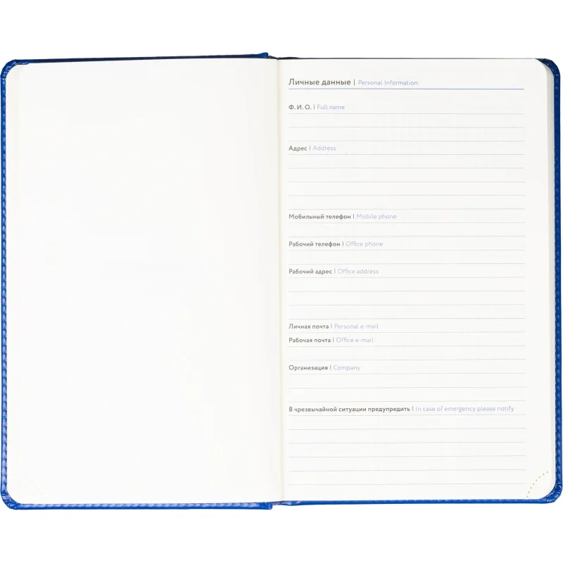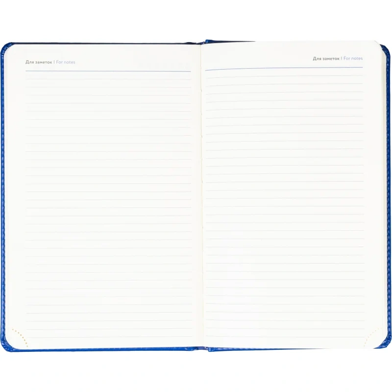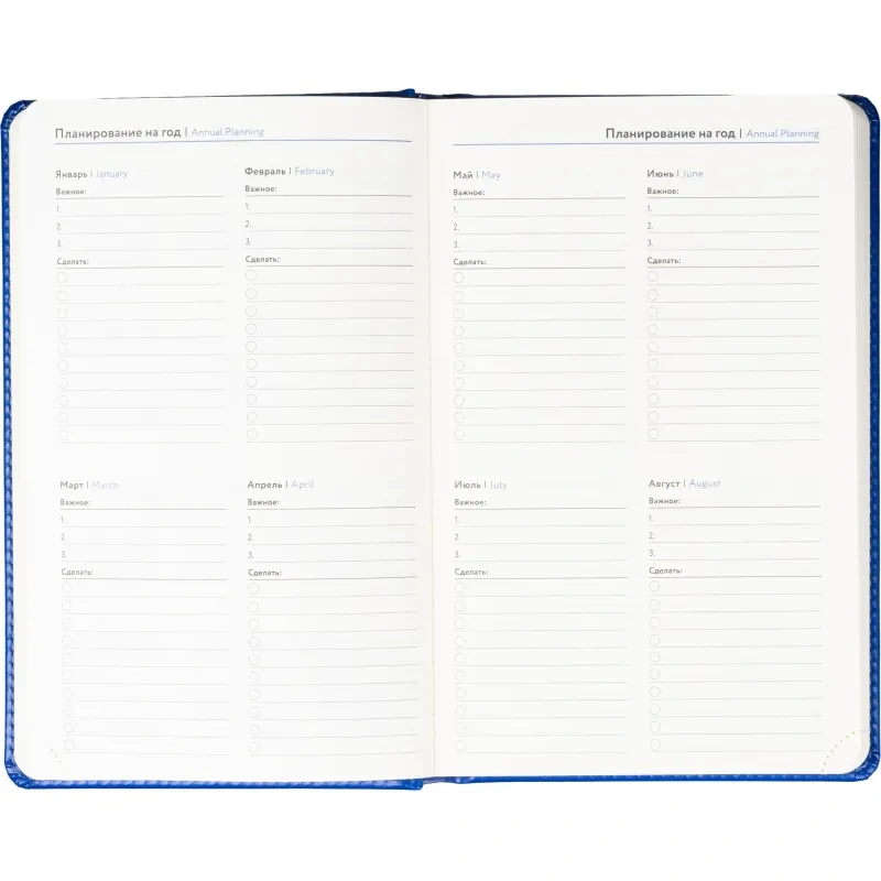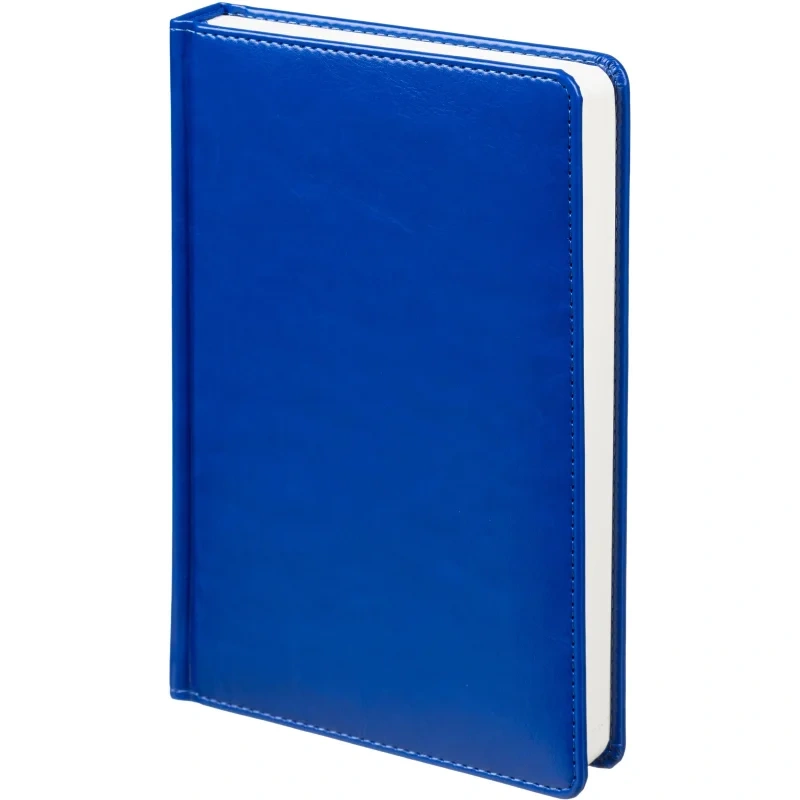 Ежедневник формата A5 предназначен для ведения записей и заметок без привязки к конкретным датам. Обложка выполнена из искусственной кожи тёмно-синего цвета с тиснением и оформлена в однотонном стиле. Твёрдый переплёт обеспечивает устойчивость формы, а сшивка внутреннего блока делает изделие надёжным при частом использовании.