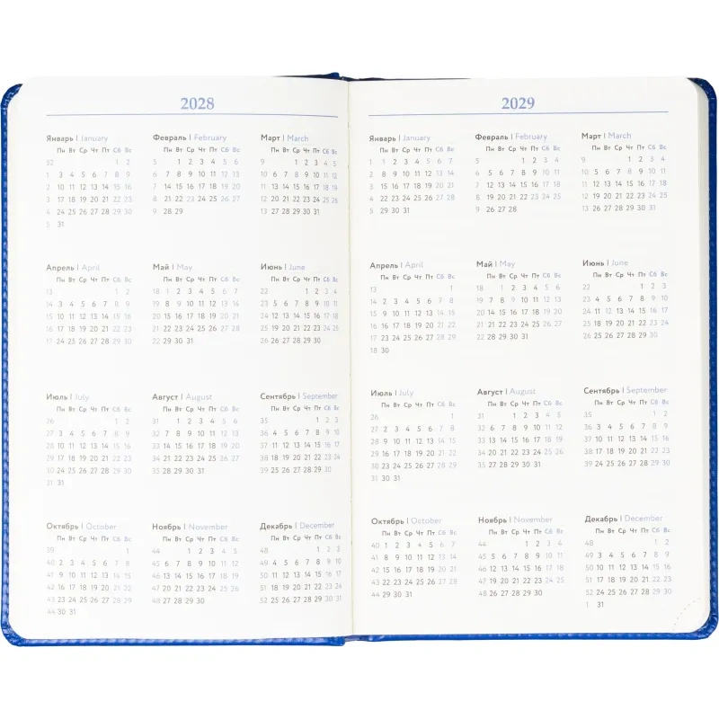 Размер изделия составляет 13.8×21.3 см. Внутри предусмотрен календарь на два года. Ежедневник подходит под персонализацию.