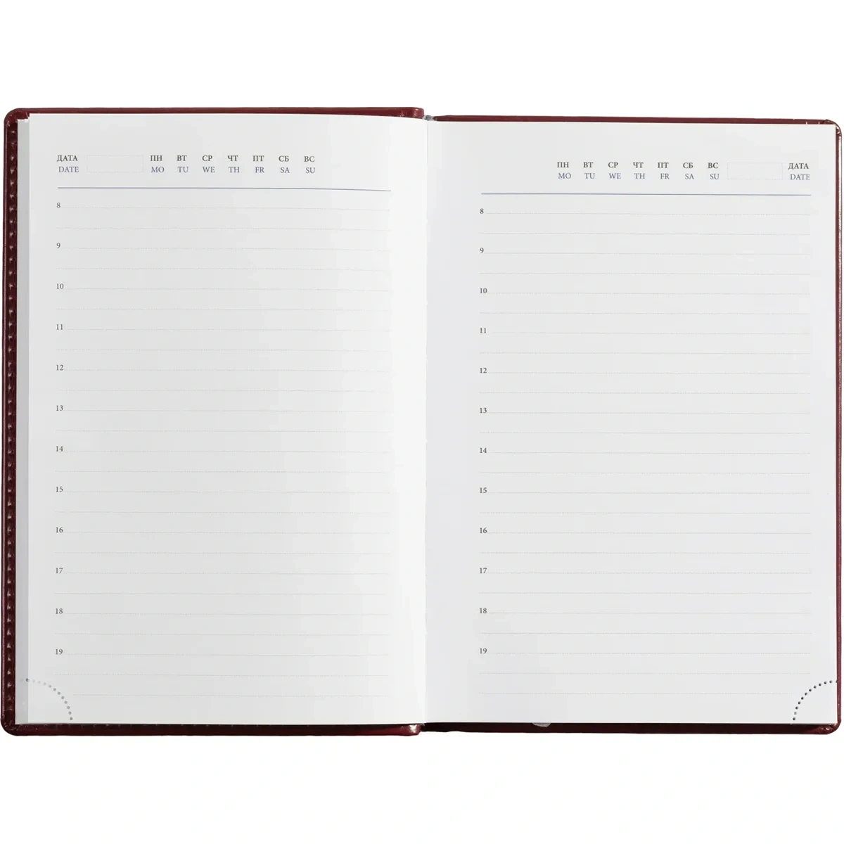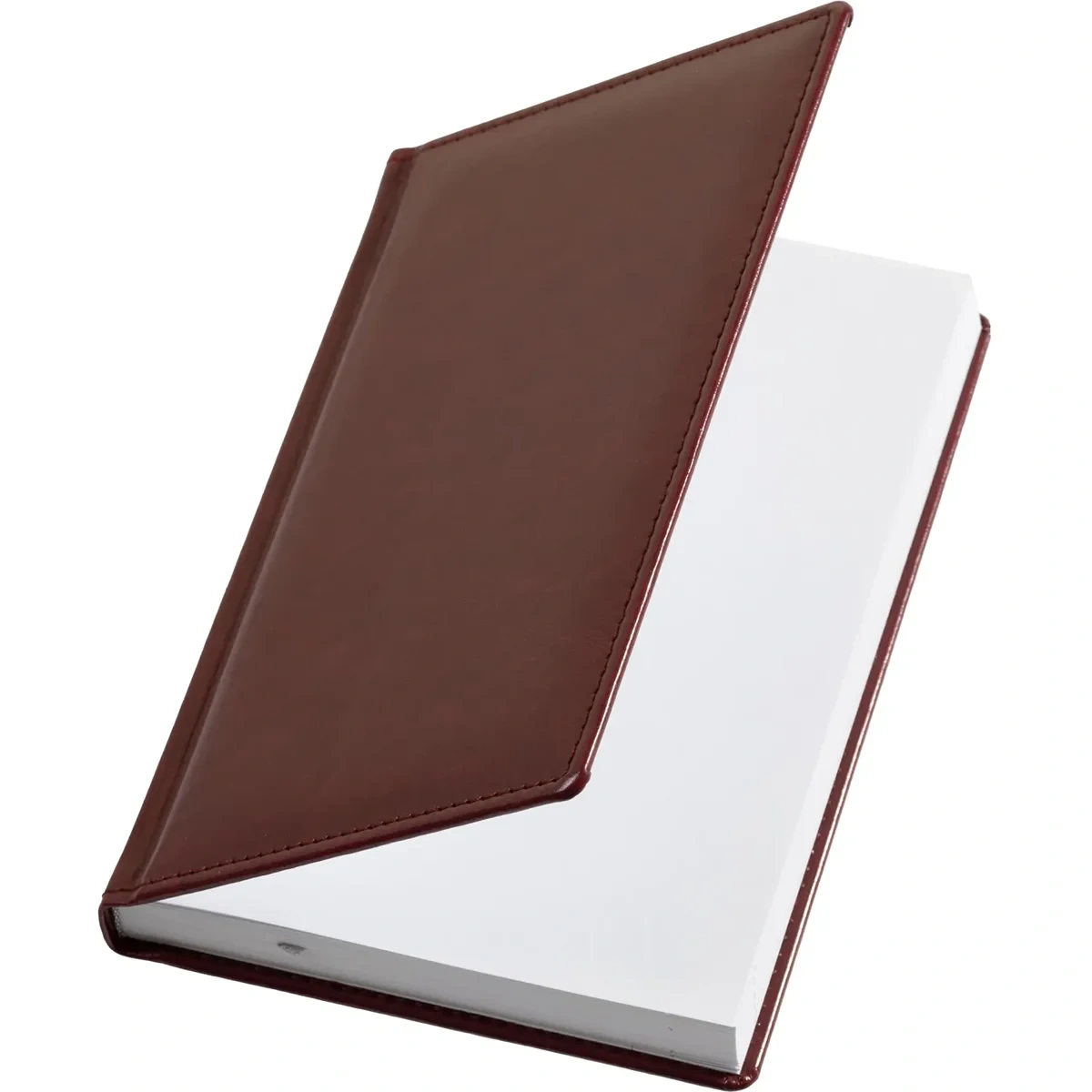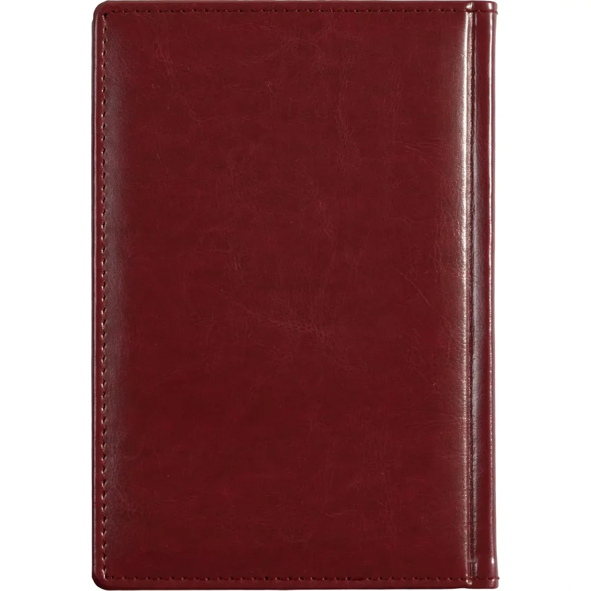 Ежедневник размером 148×218 мм выполнен с однотонной бордовой обложкой из высококачественного переплётного материала, имитирующего натуральную кожу. Обложка твёрдая, с поролоном и гладкой фактурой с лёгким блеском, по периметру украшена отделочной строчкой в цвет материала. Возможна персонализация — нанесение логотипа любым способом тиснения.