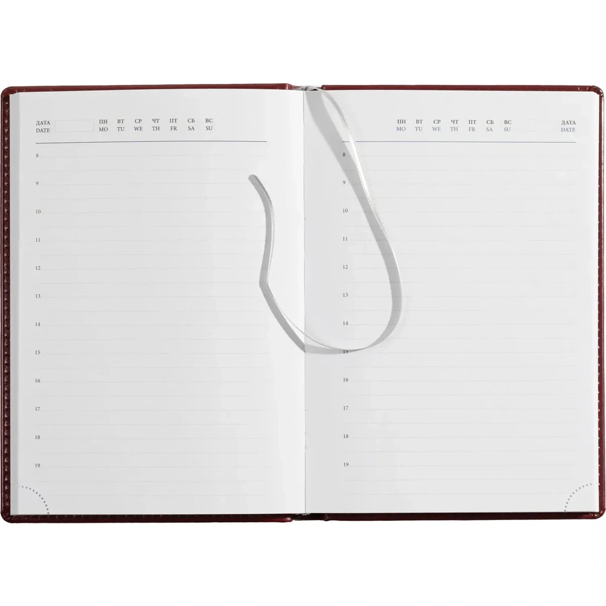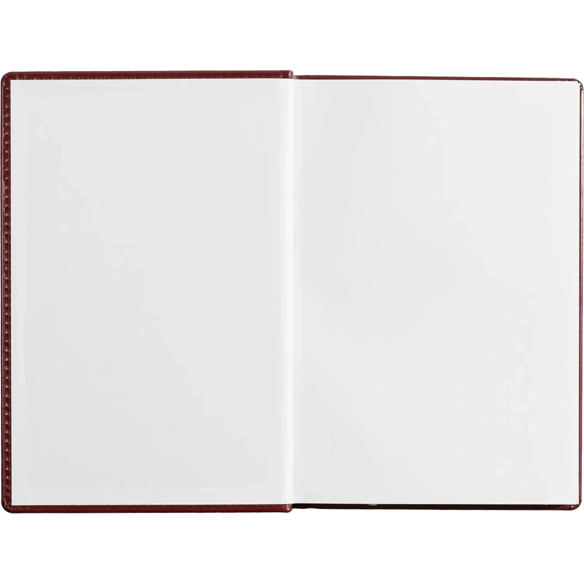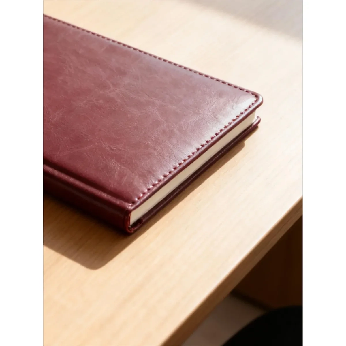 Ежедневник размером 148×218 мм выполнен с однотонной бордовой обложкой из высококачественного переплётного материала, имитирующего натуральную кожу. Обложка твёрдая, с поролоном и гладкой фактурой с лёгким блеском, по периметру украшена отделочной строчкой в цвет материала. Возможна персонализация — нанесение логотипа любым способом тиснения.