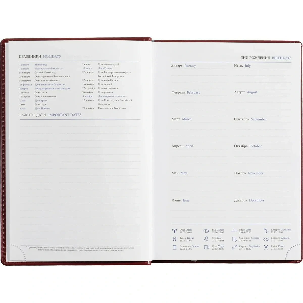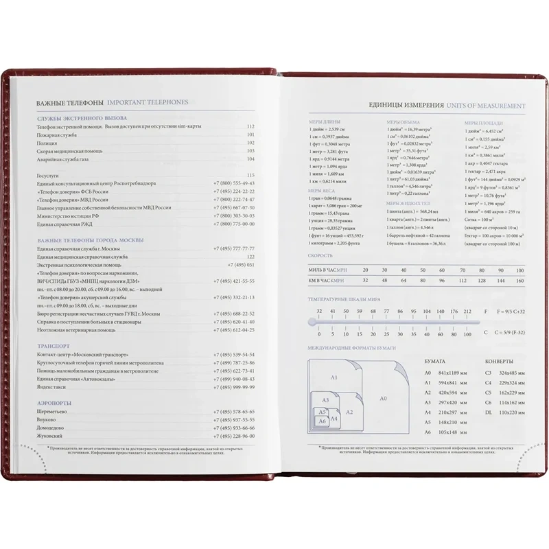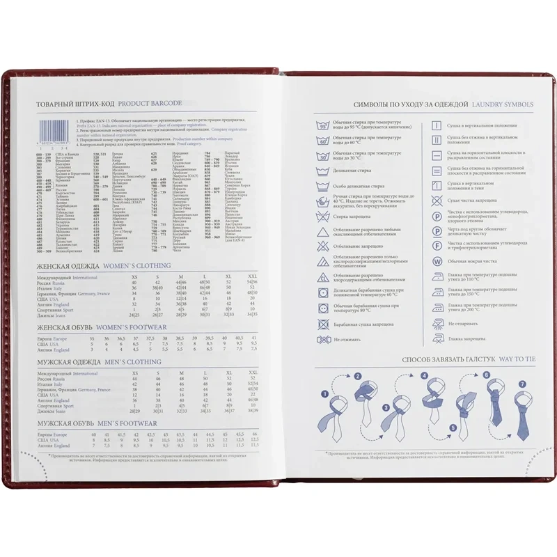 Ежедневник включает информационно-справочный блок с разделами: личные данные, праздники, междугородные телефонные коды городов России, важные телефоны Москвы и Санкт-Петербурга, международные размеры одежды, знаки зодиака, штриховой код, сведения по странам, справочная информация о мерах длины, температуре, международных форматах бумаги, цифровые коды ГИБДД, планы на год.