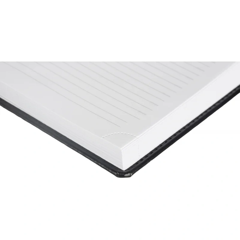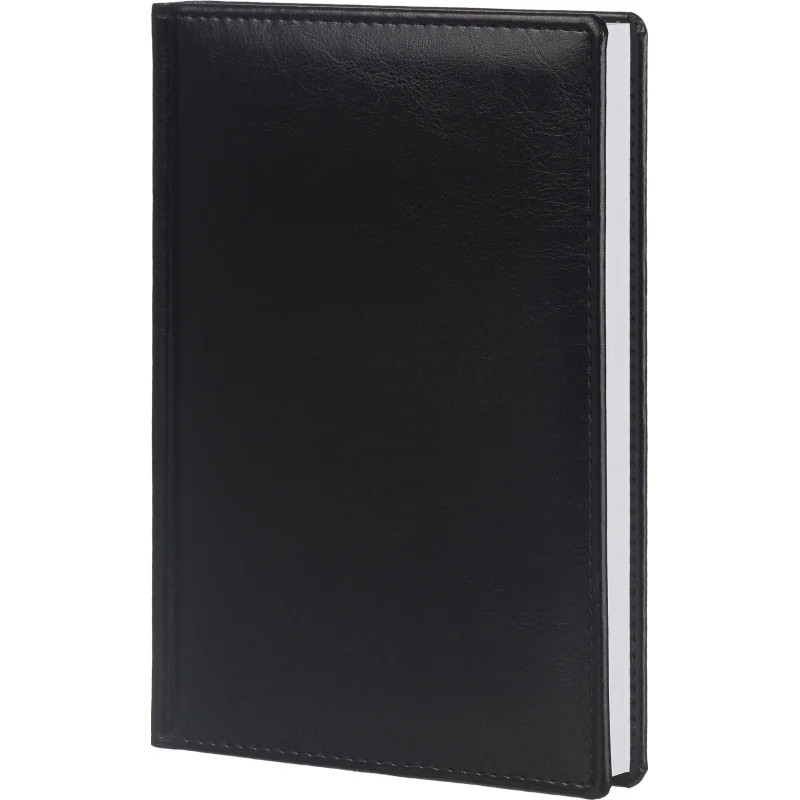 Ежедневник размером 148×218 мм выполнен с однотонной чёрной обложкой из высококачественного переплётного материала, имитирующего натуральную кожу. Обложка твёрдая, с поролоном и гладкой фактурой с лёгким блеском, по периметру украшена отделочной строчкой в цвет материала. Возможна персонализация — нанесение логотипа любым способом тиснения.