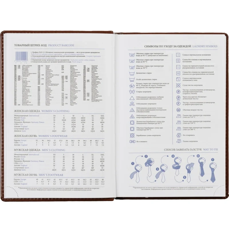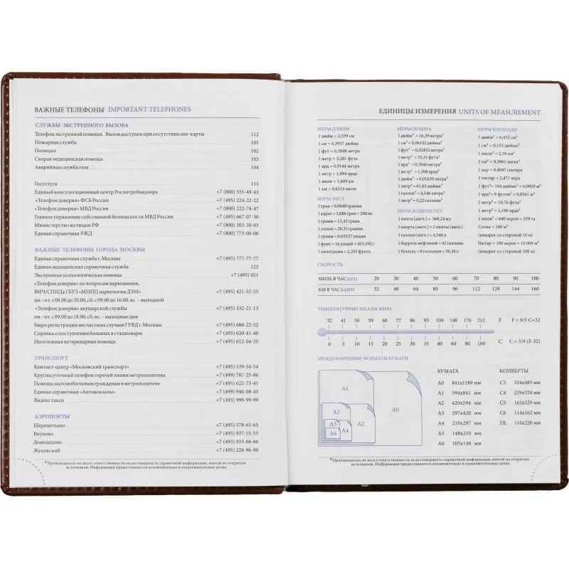 В справочном разделе собрана полезная информация: личные данные, праздники, междугородные телефонные коды городов России, важные телефоны Москвы, Санкт-Петербурга и Екатеринбурга, международные размеры одежды, знаки зодиака, штрих-коды, сведения по странам, меры длины, температуры, международные форматы бумаги, цифровые коды ГИБДД и планы на год. Крепление блока — сшивка.