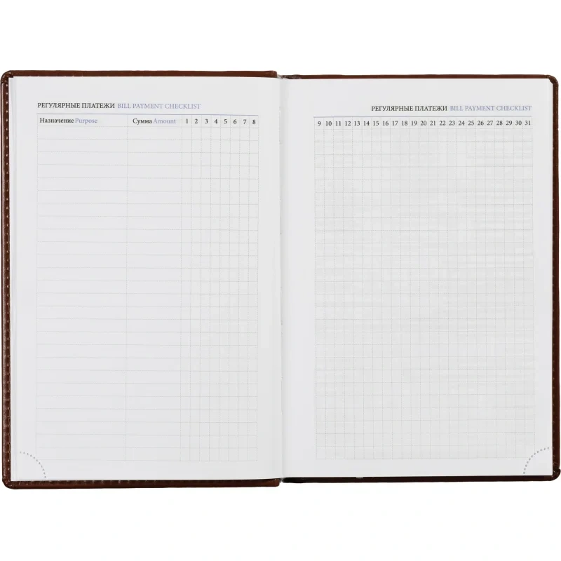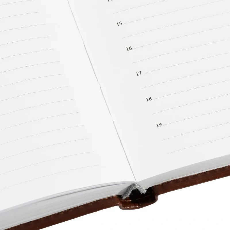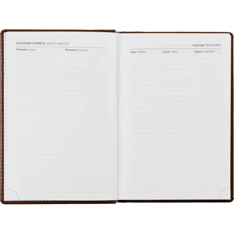 Внутренний блок состоит из 176 листов (352 страницы) белой офсетной бумаги плотностью 90 г/кв.м. с линовкой в линейку. Печать выполнена в двух красках. Листы оснащены перфорацией уголков, блок дополнен закладкой-ляссе. В конце ежедневника расположен алфавитный блок без вырубки.