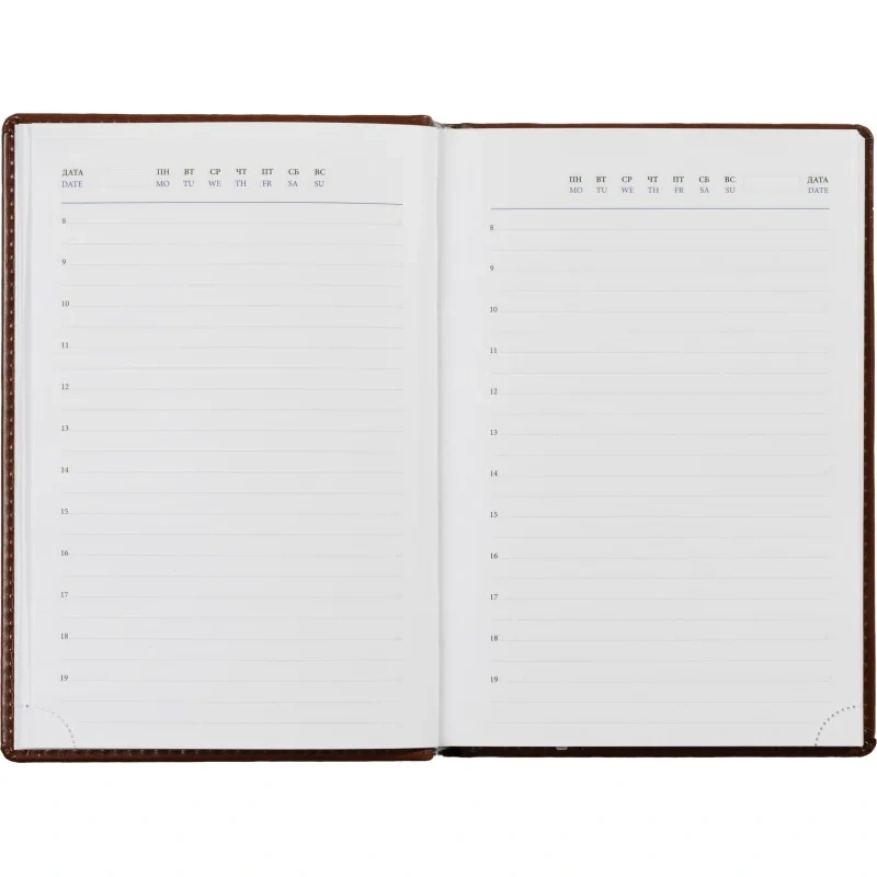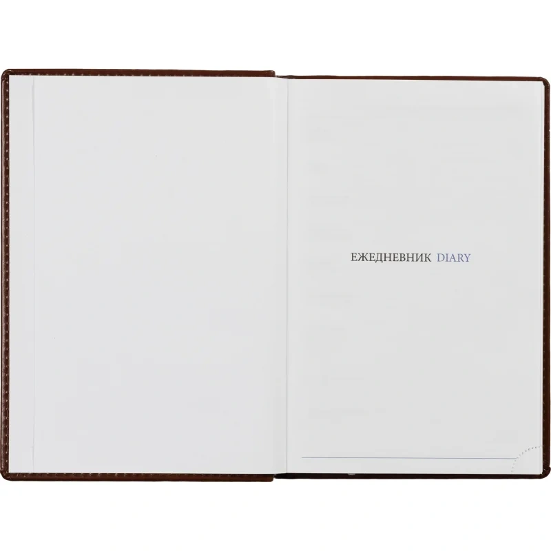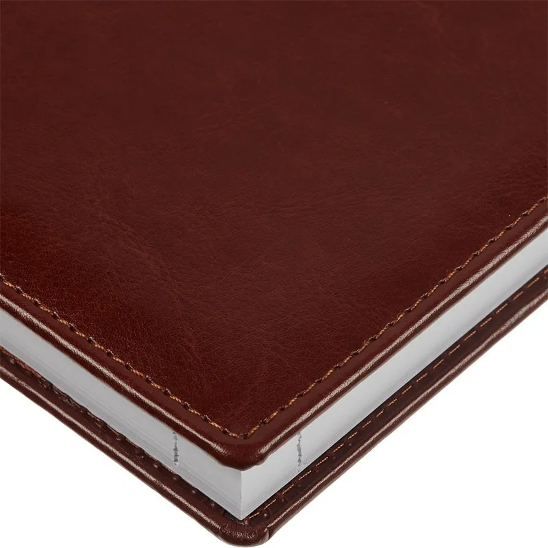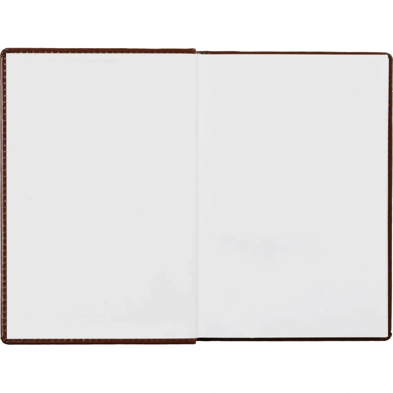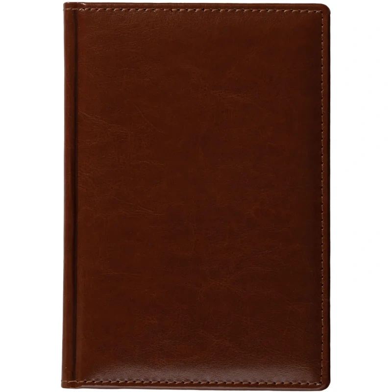Ежедневник размером 148×218 мм выполнен с однотонной коричневой обложкой из искусственной кожи с поролоновым наполнителем. Обложка имитирует натуральную кожу, имеет гладкую фактуру с лёгким блеском и отделочную строчку по периметру в цвет материала. Возможна персонализация — нанесение логотипа любым способом тиснения.