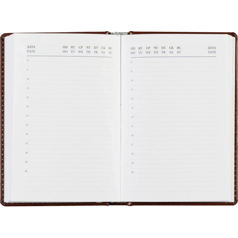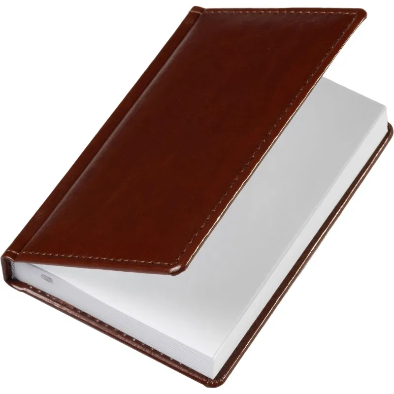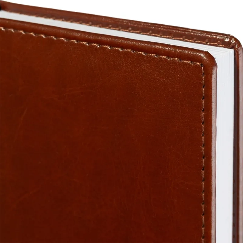 Ежедневник размером 100×150 мм выполнен с однотонной коричневой обложкой из высококачественного переплётного материала, имитирующего натуральную кожу. Обложка твёрдая, с поролоном и гладкой фактурой с лёгким блеском, по периметру украшена отделочной строчкой в цвет материала. Возможна персонализация — нанесение логотипа любым способом тиснения.