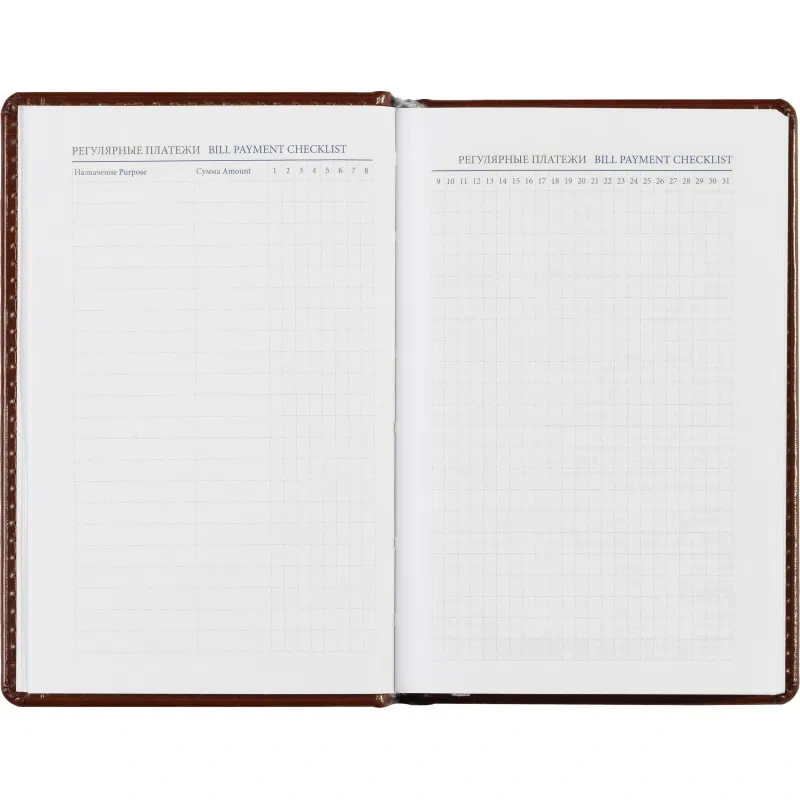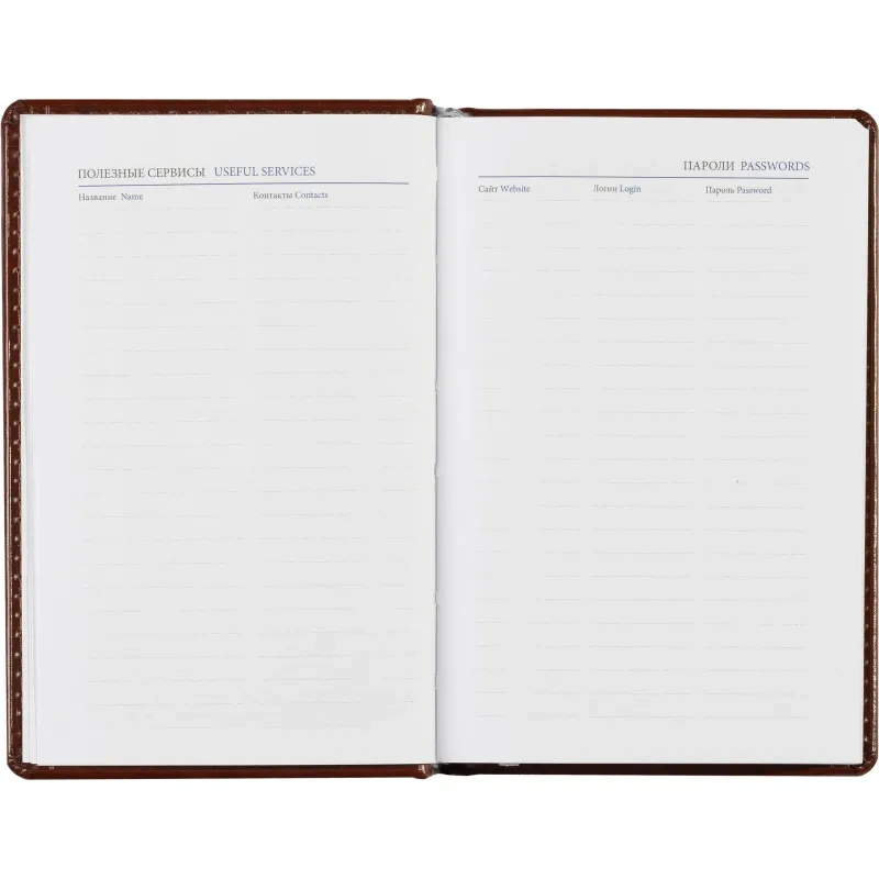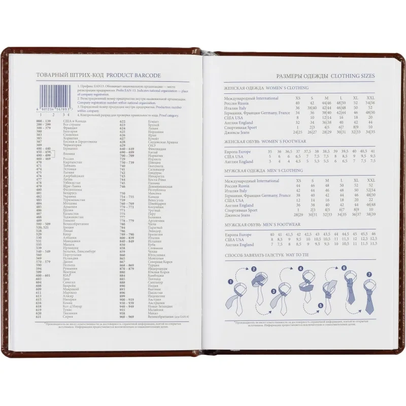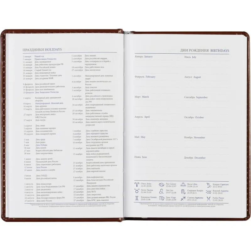 В ежедневнике есть информационно-справочный блок с разделами: личные данные, праздники, междугородные телефонные коды городов России, важные телефоны Москвы и Санкт-Петербурга, международные размеры одежды, знаки зодиака, штриховой код, сведения по странам, справочная информация о мерах длины, температуре, международных форматах бумаги, цифровые коды ГИБДД, планы на год. В конце блока — вставка для заметок.