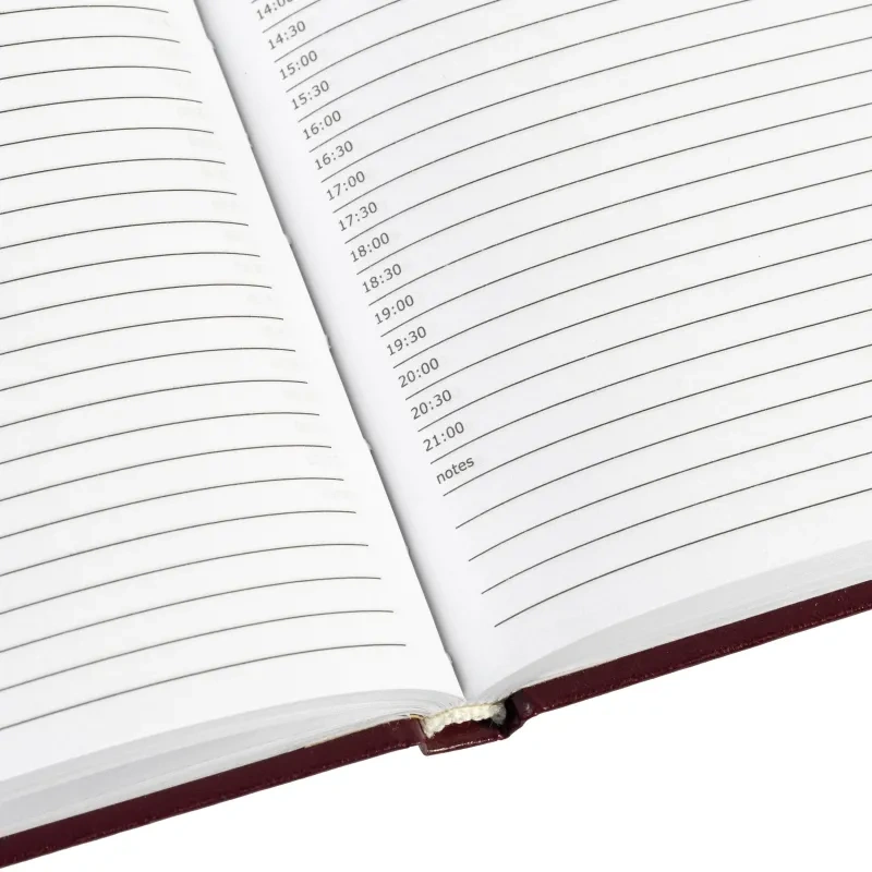 Внутренний блок состоит из 128 листов (256 страниц) белой офсетной бумаги плотностью 65 г/кв.м. Листы в линейку напечатаны в одну краску. На одну страницу приходится один день недели с разбивкой на 30-минутные интервалы с 8:00 до 21:00 и свободными строками для заметок.