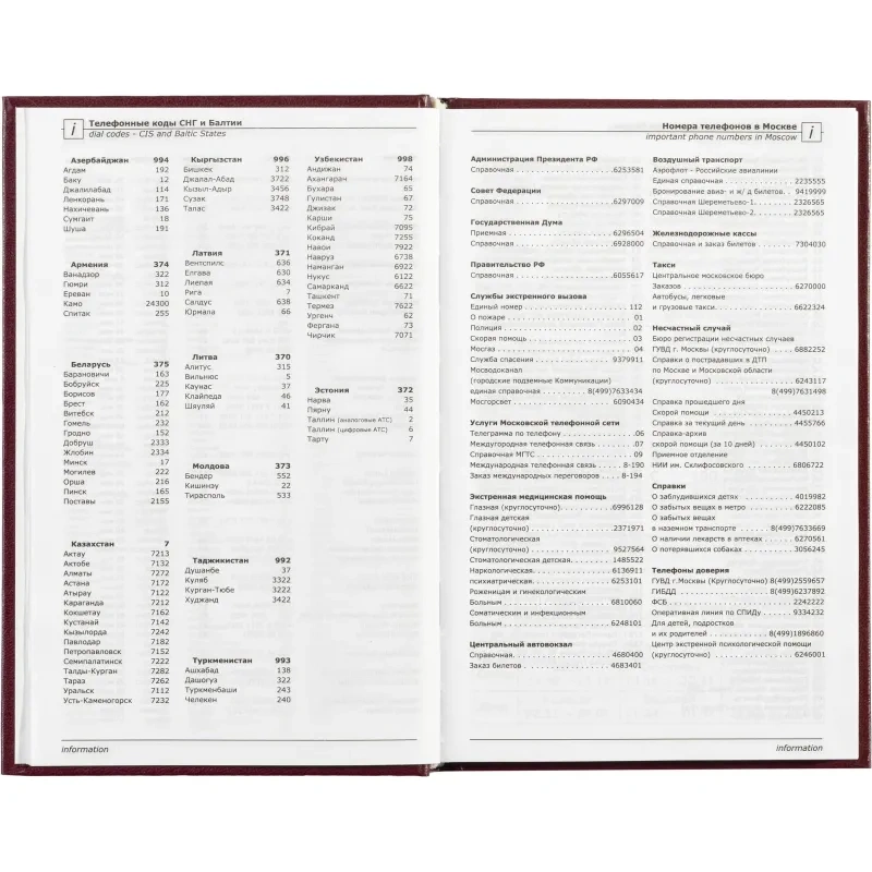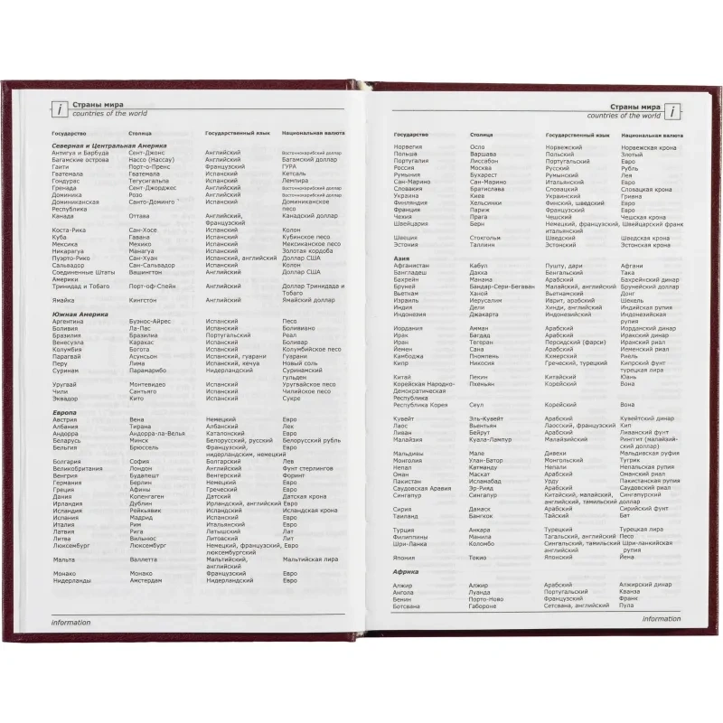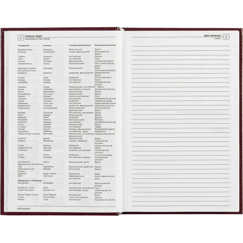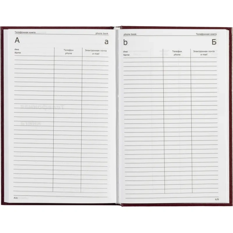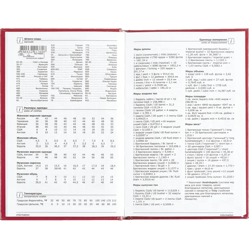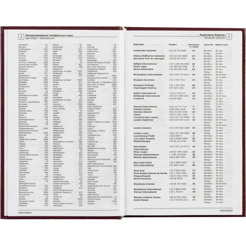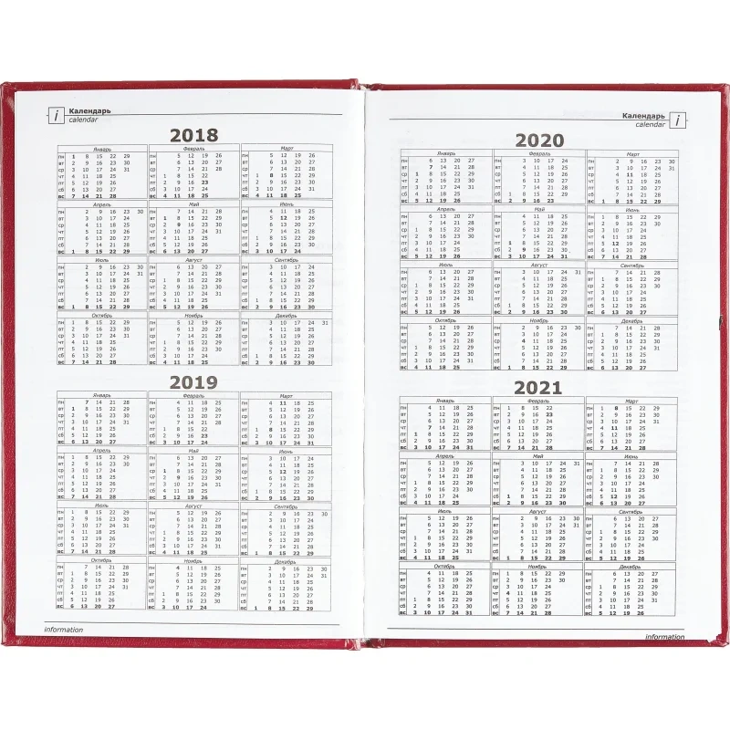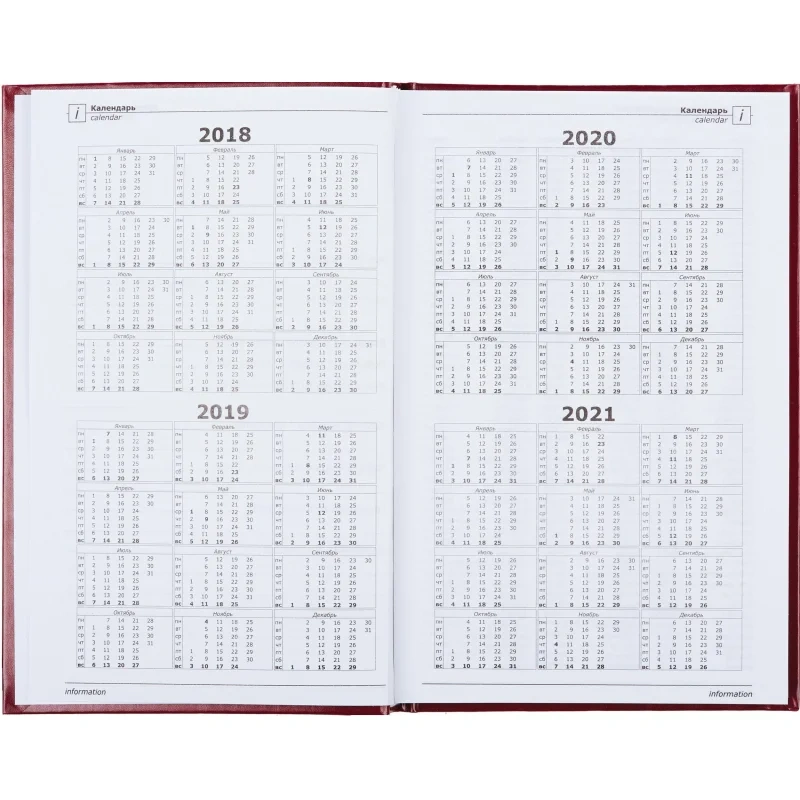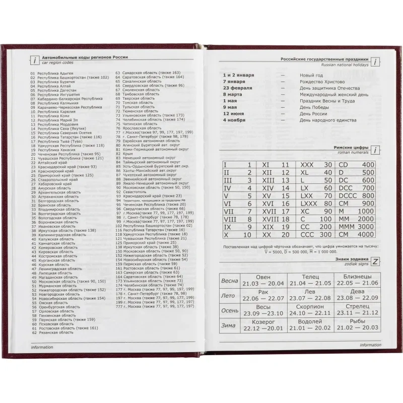 Ежедневник содержит справочный информационный блок с личными данными, календарём на 2020–2023 годы, телефонными кодами России и мира, списком аэропортов, московскими телефонами, автомобильными кодами, римскими цифрами, государственными праздниками, штрихкодированием, размерами одежды, данными о температурах, единицах измерения длины, объёма и веса, информацией о странах мира, страницами для заметок, важными датами и телефонной книгой. В изделии предусмотрена вставка — алфавитный блок без вырубки.