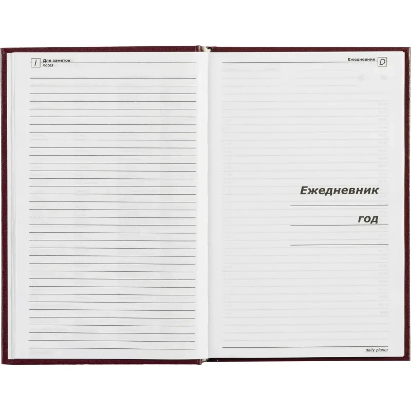Ежедневник размером 128×200 мм выполнен с твёрдой однотонной бордовой обложкой из бумвинила — современного переплётного материала на бумажной основе с тиснением золотой фольгой.