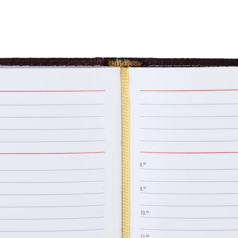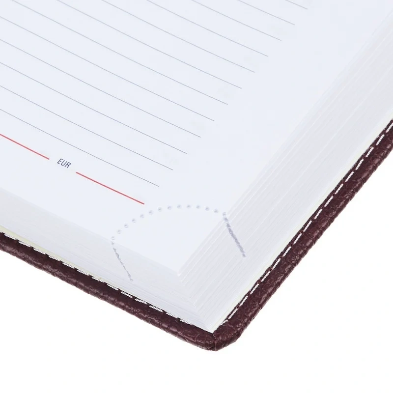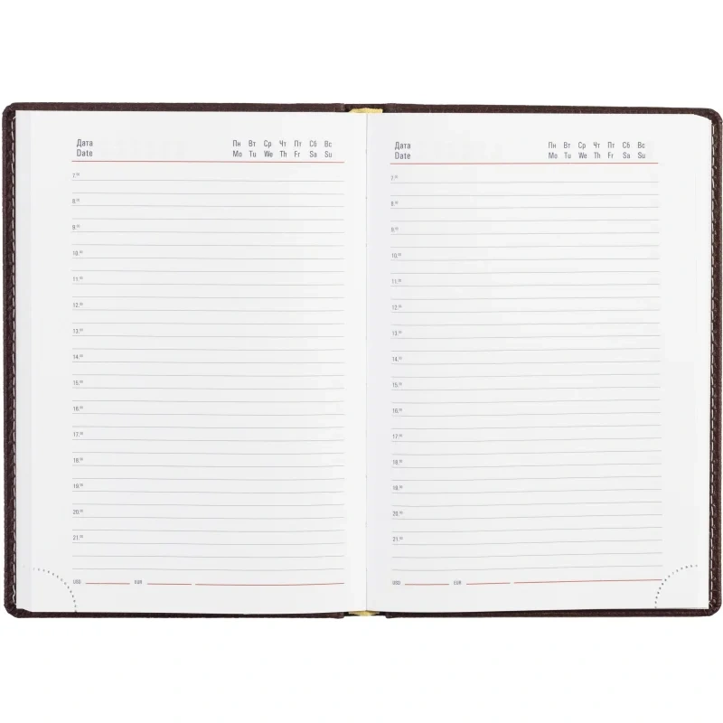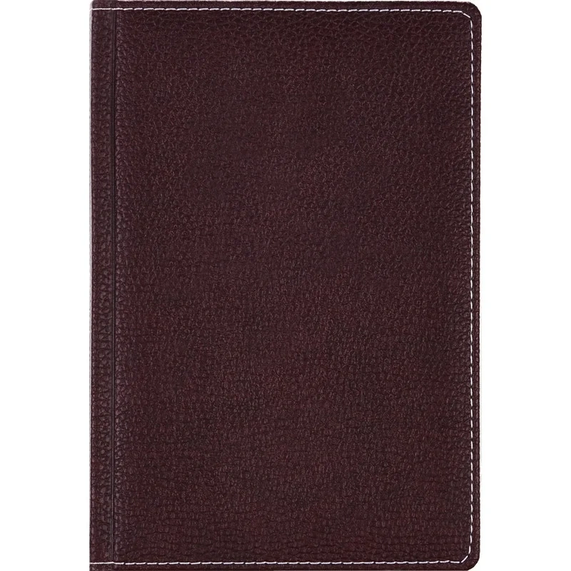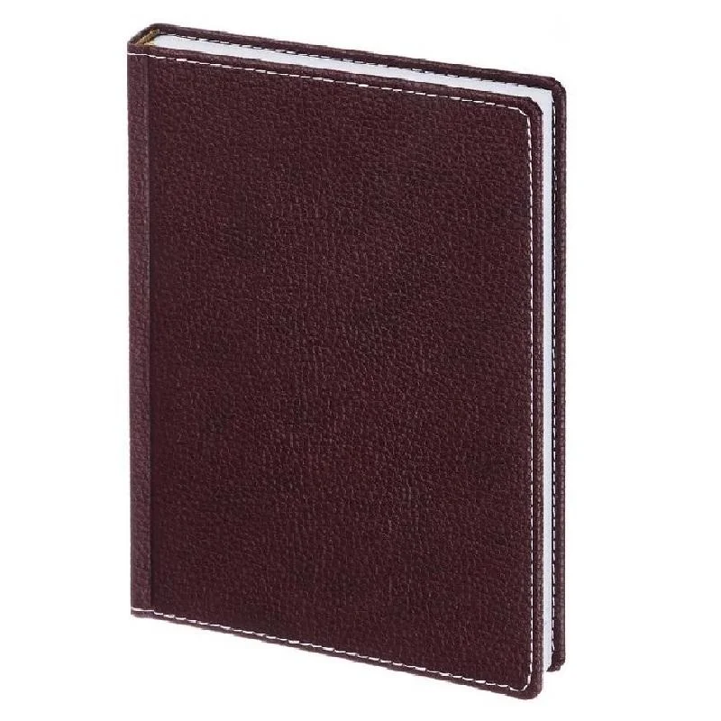 Ежедневник размером 142×210 мм выполнен с мягкой бордовой обложкой из искусственной кожи высокого качества с отделочной белой прострочкой по периметру. Обложка однотонная, вертикальной ориентации.