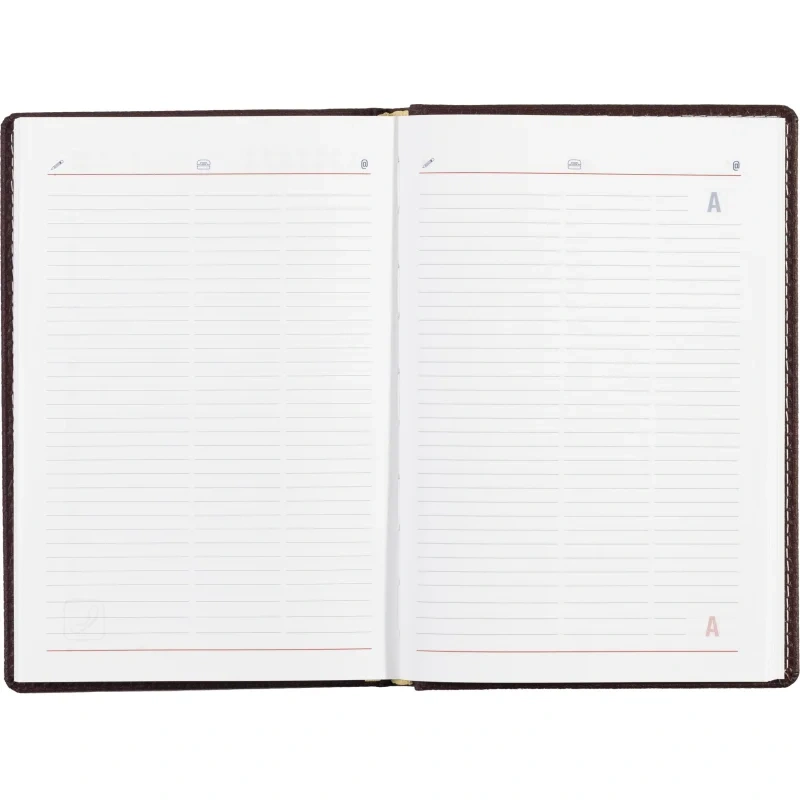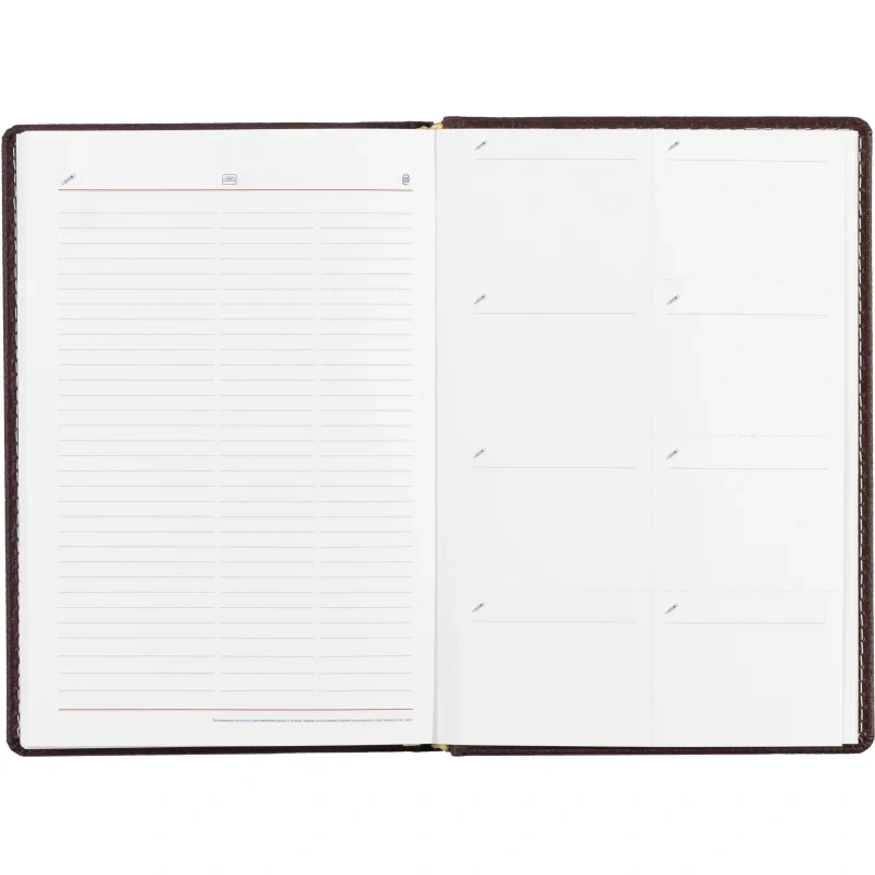 Внутренний блок состоит из 176 листов (352 страницы) белой офсетной бумаги плотностью 90 г/кв.м. Листы снабжены линейкой, перфорацией уголков и закладкой-ляссе. Печать выполнена в четыре краски. Цветной обрез отсутствует, углы листов не скруглены.