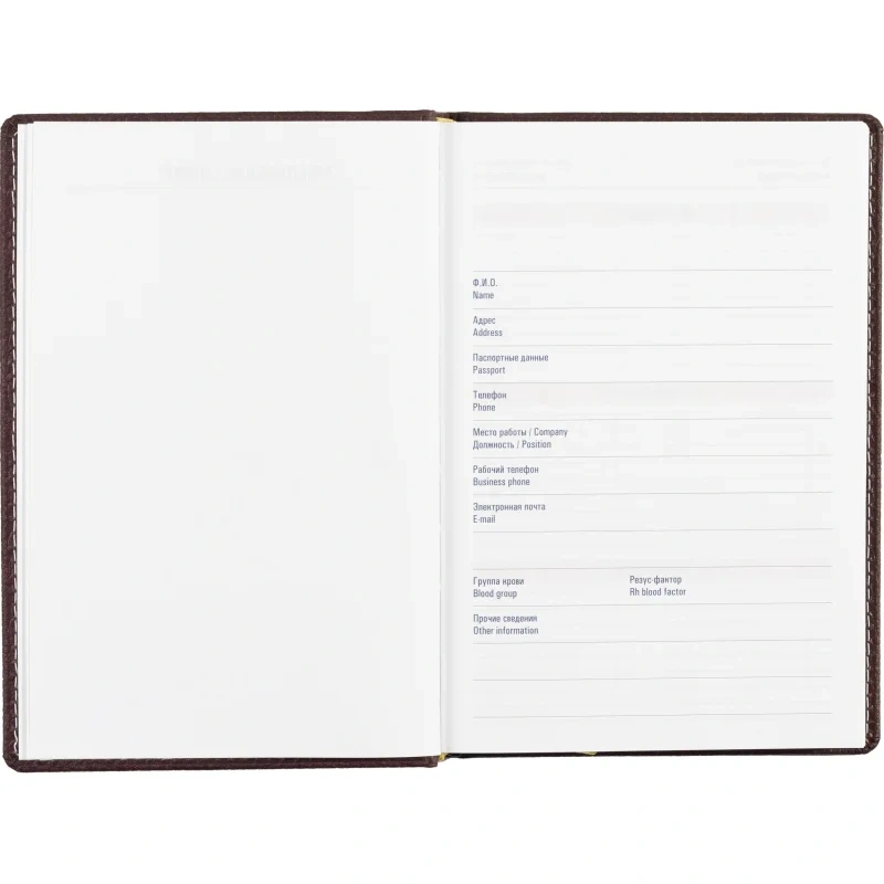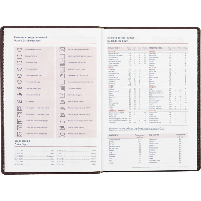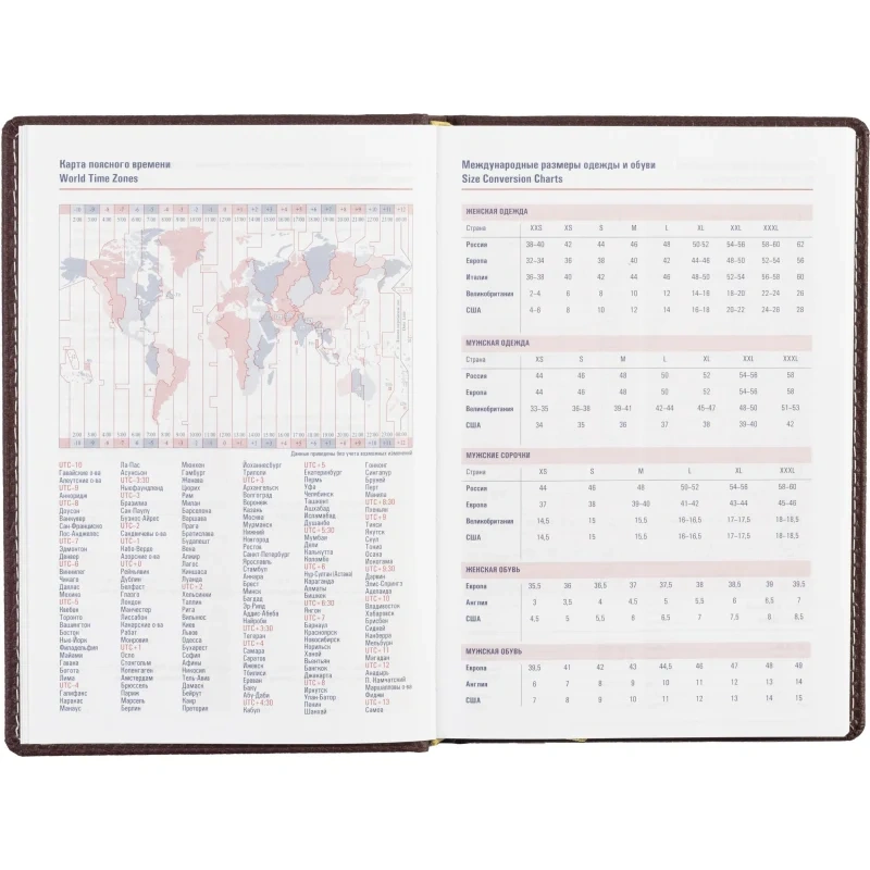 Ежедневник содержит информационно-справочный блок с личными данными, телефонами первой необходимости, автомобильными кодами регионов России, доменными зонами, картой поясного времени, размерами одежды и обуви, а также символами по уходу за одеждой.