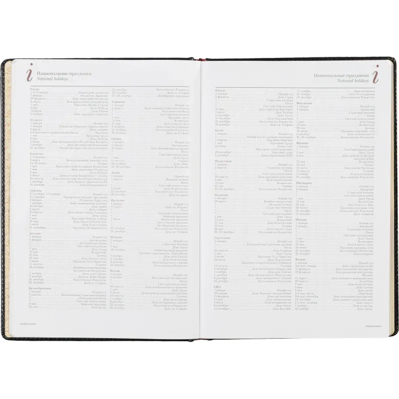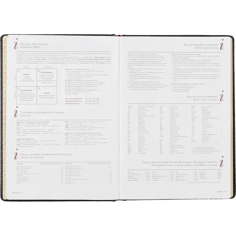 Дополнительно включена справочная информация на 7 листах (14 страницах): личные данные, часовые пояса, аэропорты Европы, международные телефонные коды, размеры одежды, штрих-коды, единицы измерения, коды стран и городов, международные и государственные праздники. В конце ежедневника — телефонная книга на 19 страницах.