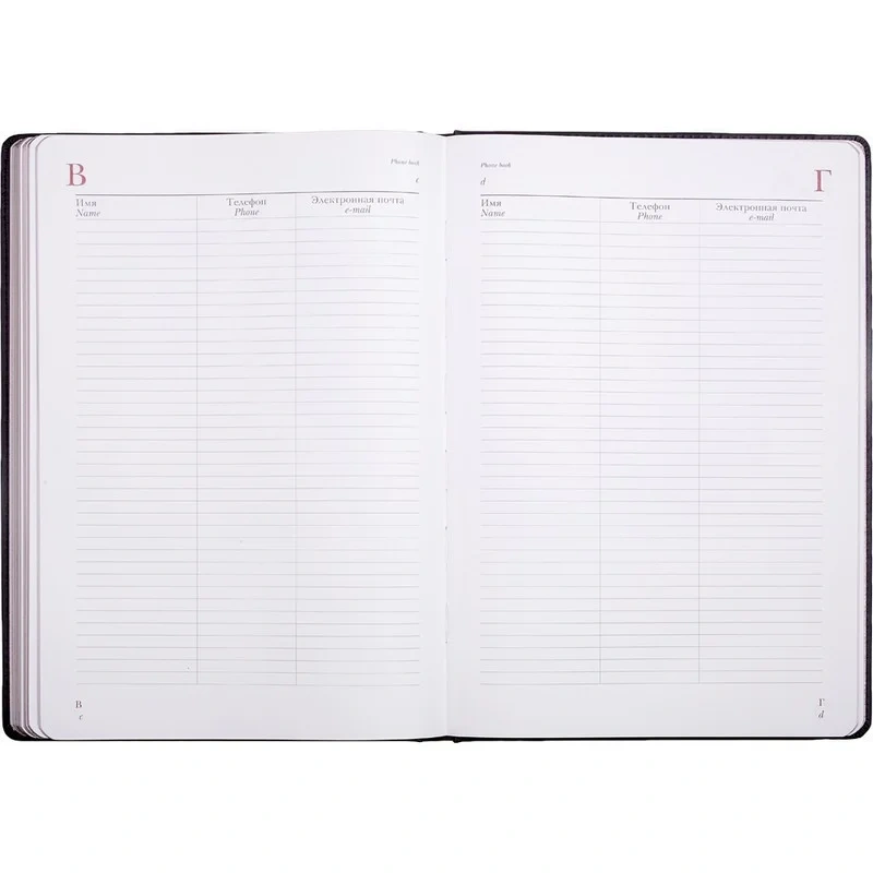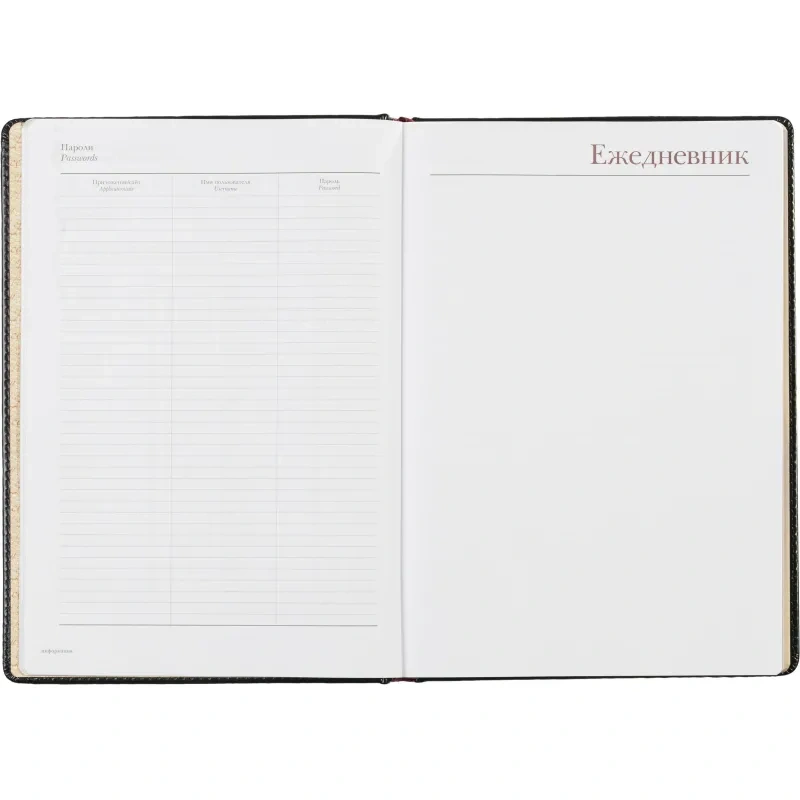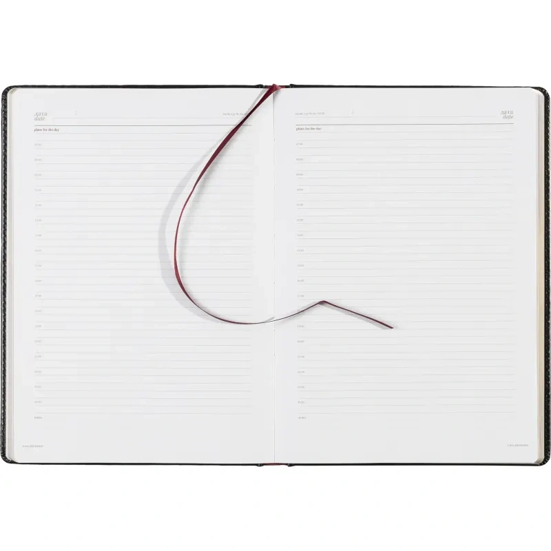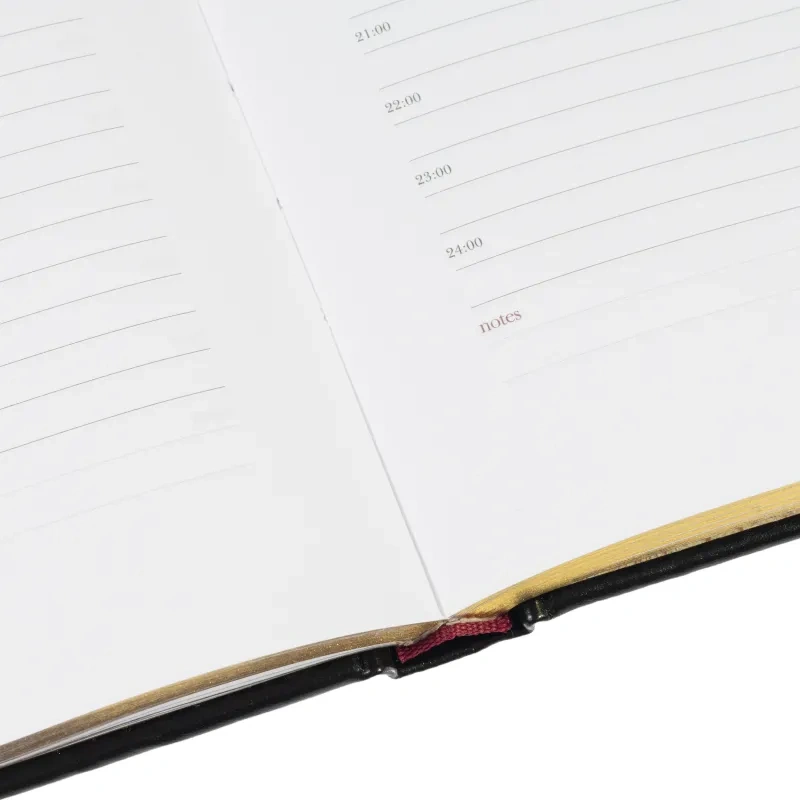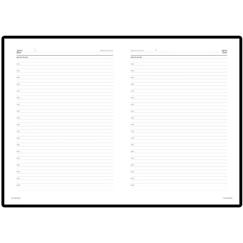 Блок ежедневника состоит из 136 листов (272 страницы) белой офсетной бумаги плотностью 70 г/кв.м. Основная часть страниц оформлена в линейку, с указанием времени рядом с графами (интервал — 1 час). В ежедневнике также предусмотрена закладка-ляссе бордового цвета для удобства навигации.