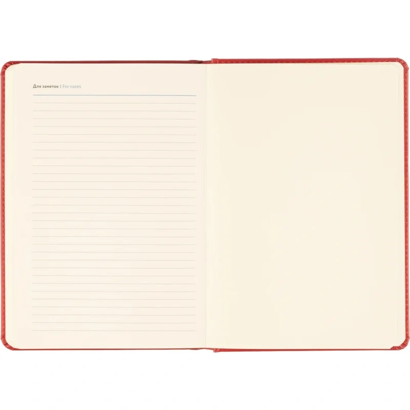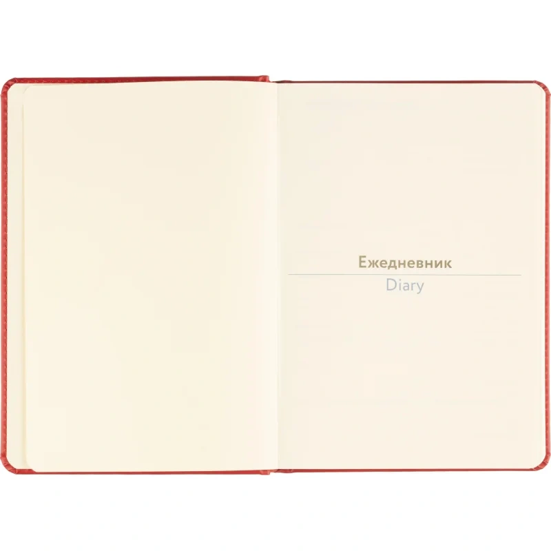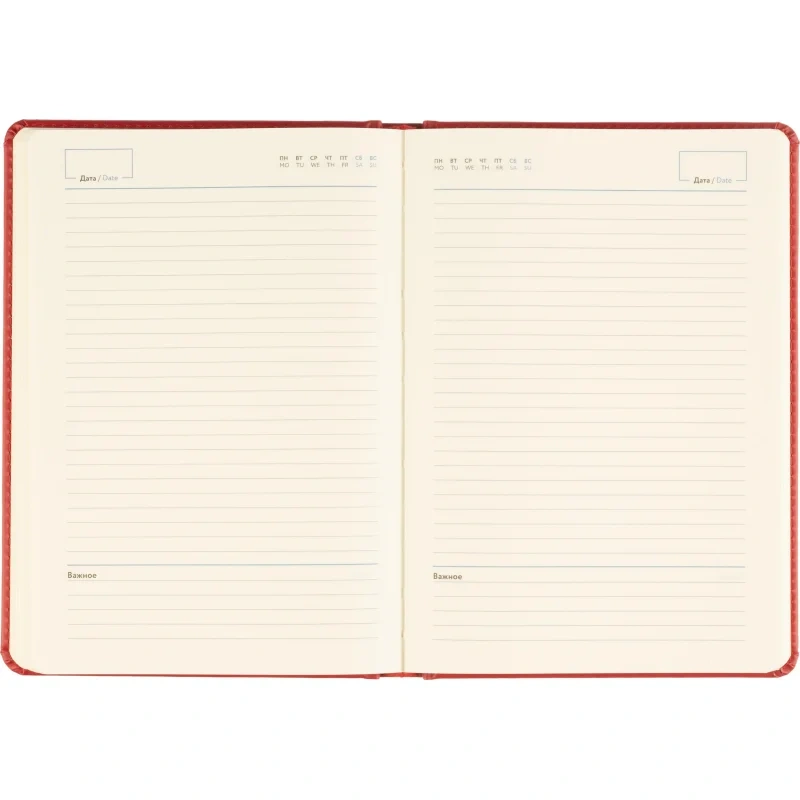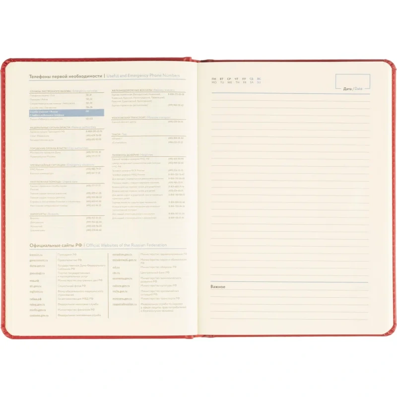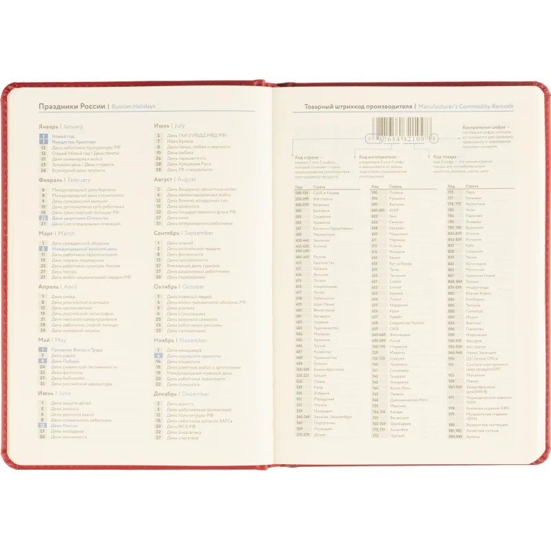 Обложка выполнена из искусственной кожи красного цвета, оформлена тиснением и дополнена прочной прострочкой по периметру. Твёрдый переплёт на сшивке гарантирует надёжность, а скруглённые углы листов и вырубка блока обеспечивают комфорт при использовании. Ежедневник дополнен ляссе и календарём на два года. Изделие подходит под персонализацию. Размер ежедневника — 14×20 см.