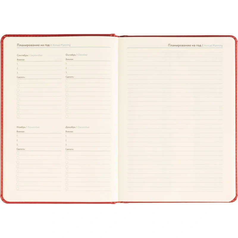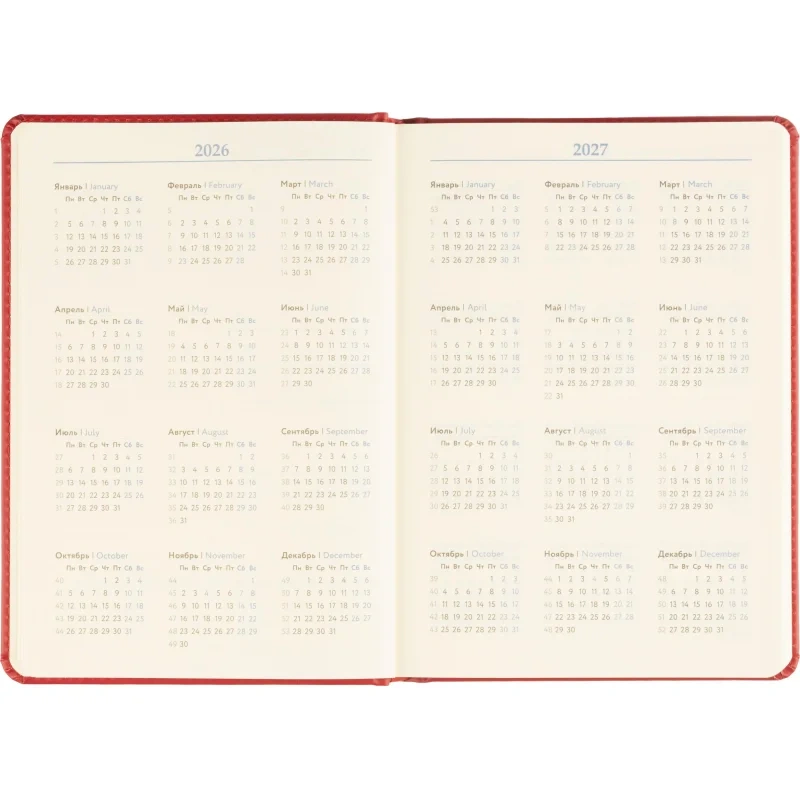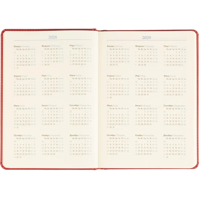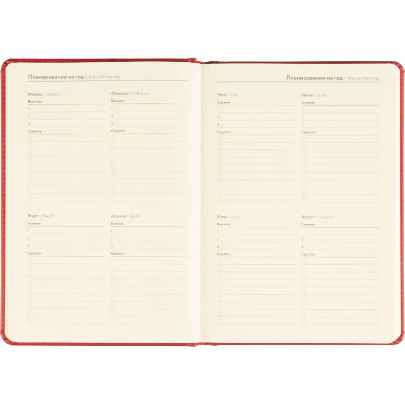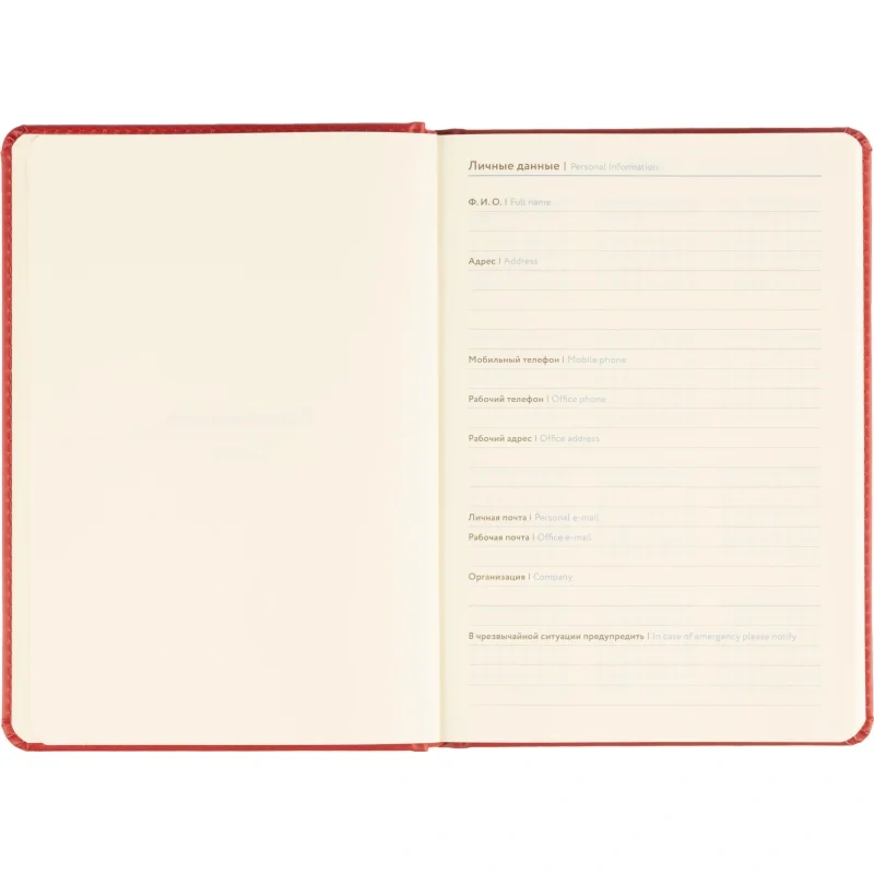 Обложка выполнена из искусственной кожи красного цвета, оформлена тиснением и дополнена прочной прострочкой по периметру. Твёрдый переплёт на сшивке гарантирует надёжность, а скруглённые углы листов и вырубка блока обеспечивают комфорт при использовании. Ежедневник дополнен ляссе и календарём на два года. Изделие подходит под персонализацию. Размер ежедневника — 14×20 см.