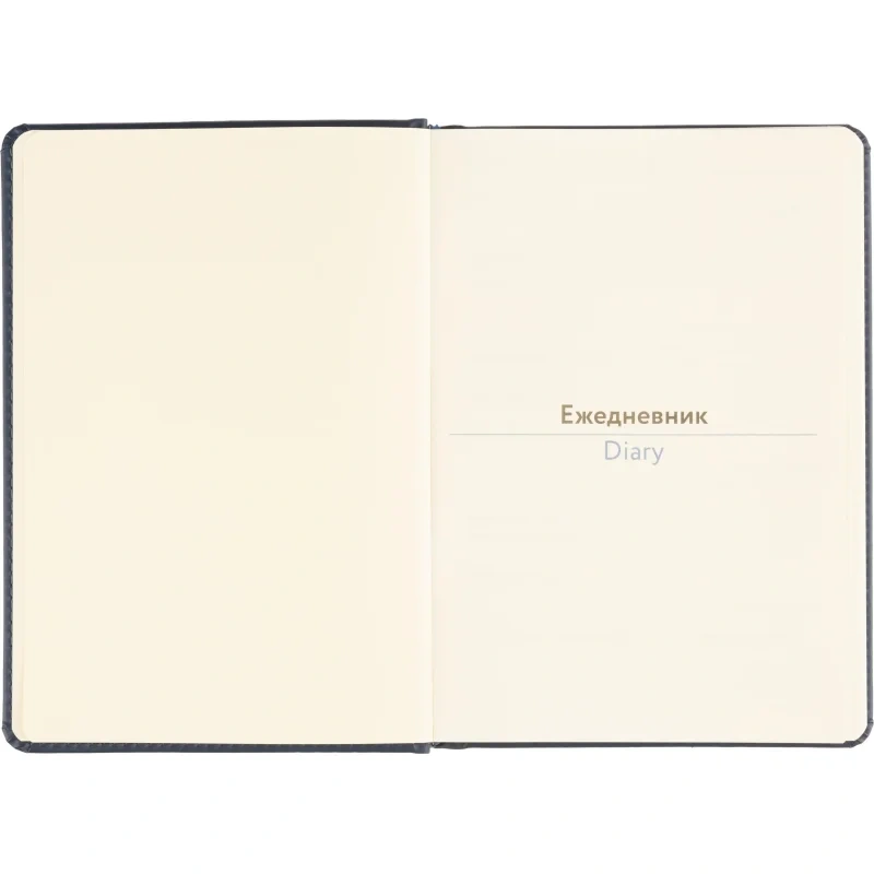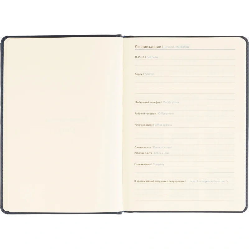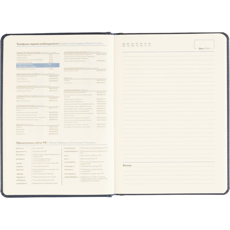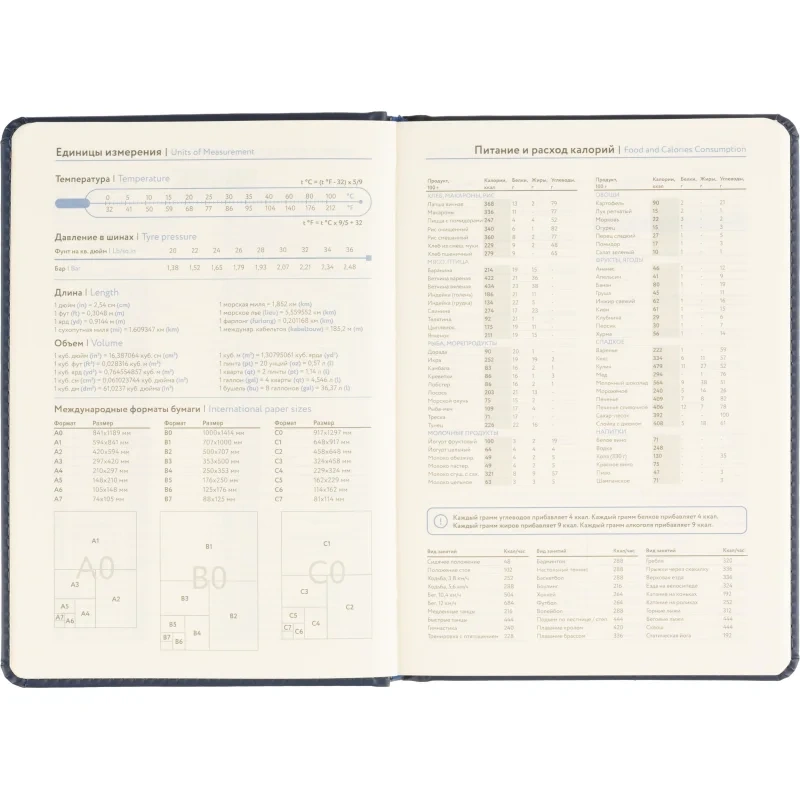 Обложка из искусственной кожи синего цвета украшена тиснением и дополнена аккуратной прострочкой по периметру. Жёсткий переплёт и надёжная сшивка блока обеспечивают устойчивость к ежедневному использованию. Скруглённые углы листов и вырубка делают перелистывание удобным, а встроенное ляссе помогает быстро находить нужную страницу.