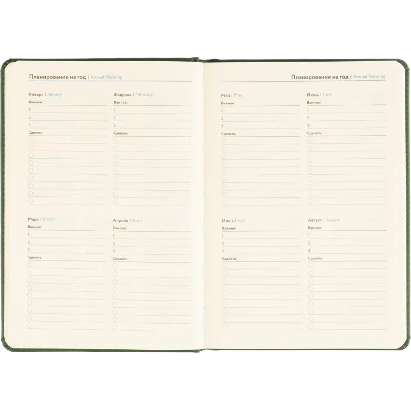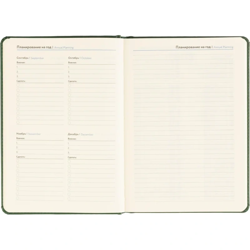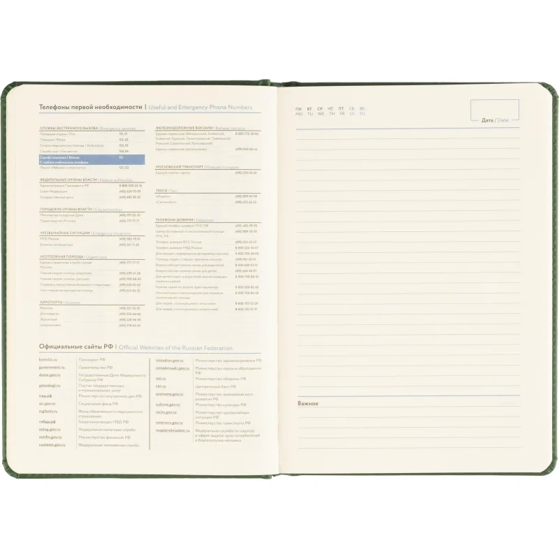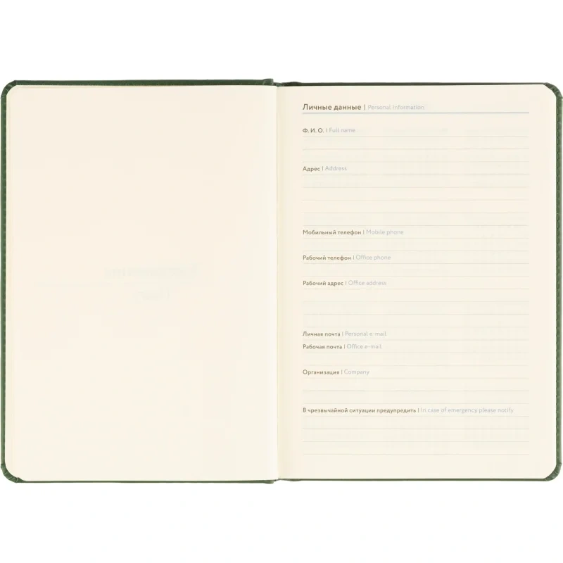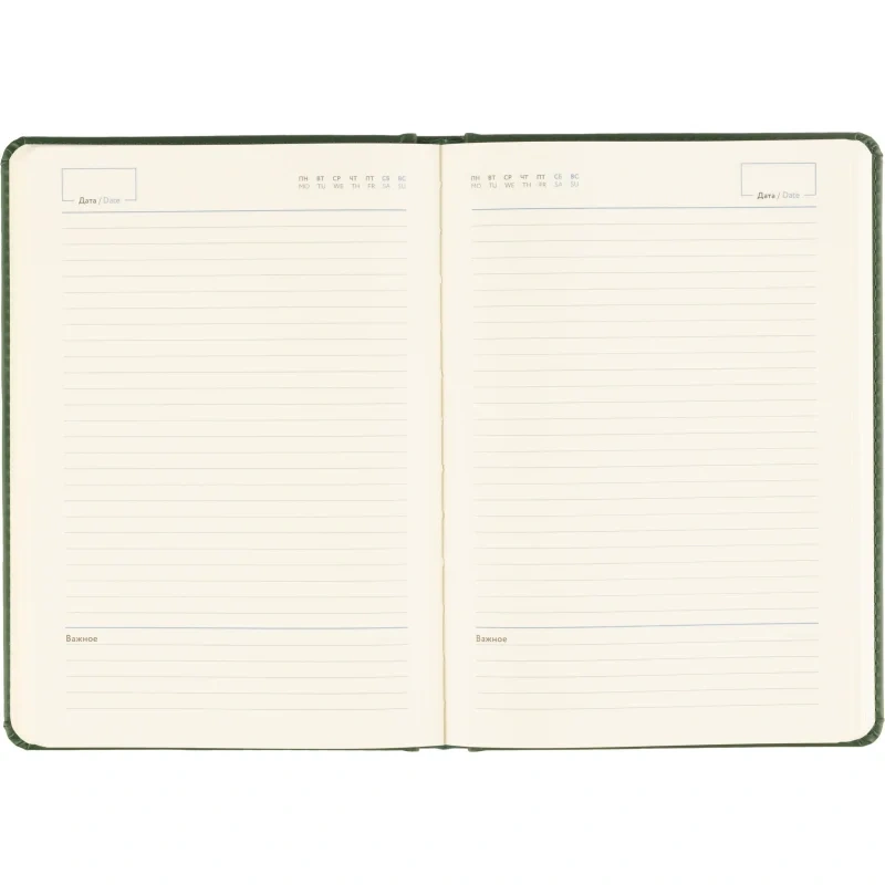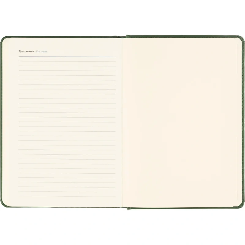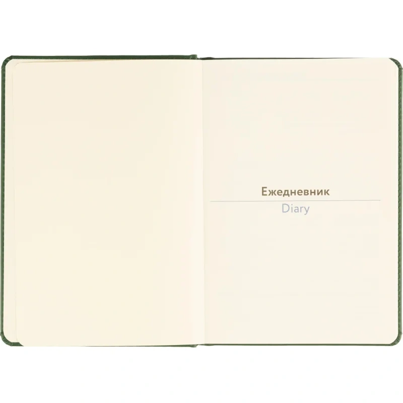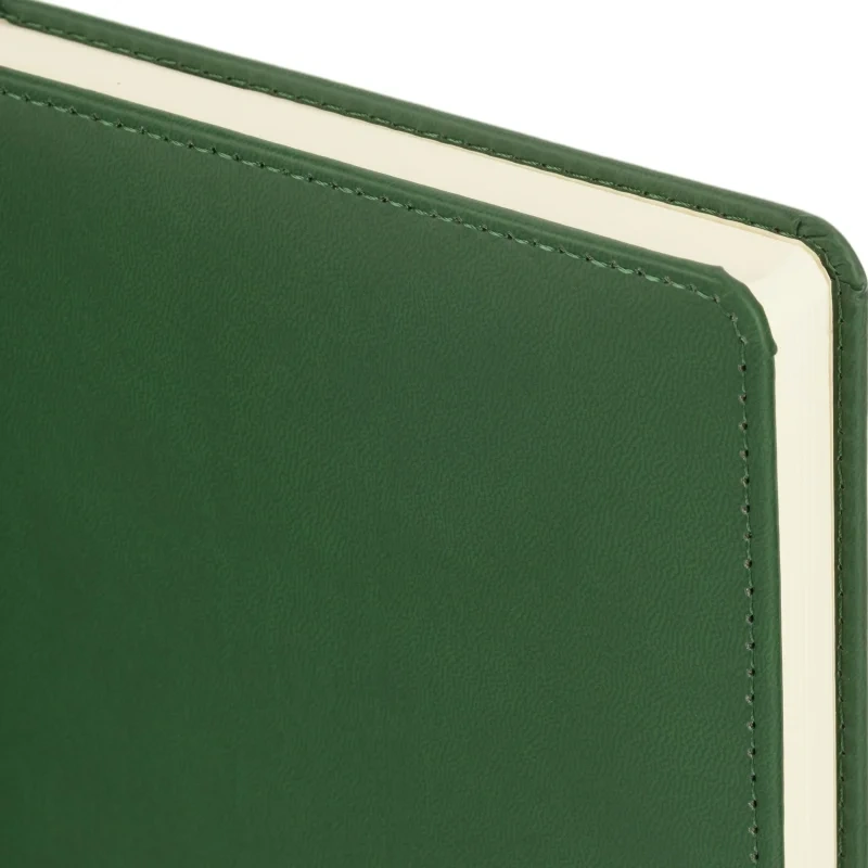 Твёрдая обложка выполнена из искусственной кожи тёмно-зелёного цвета с тиснением и аккуратной прострочкой по периметру. Скруглённые углы придают изделию законченный вид, а наличие вырубки и ляссе делает использование ежедневника удобным. Блок напечатан в две краски, что улучшает визуальное восприятие. Изделие дополнено календарём на два года и может быть использовано для персонализации.