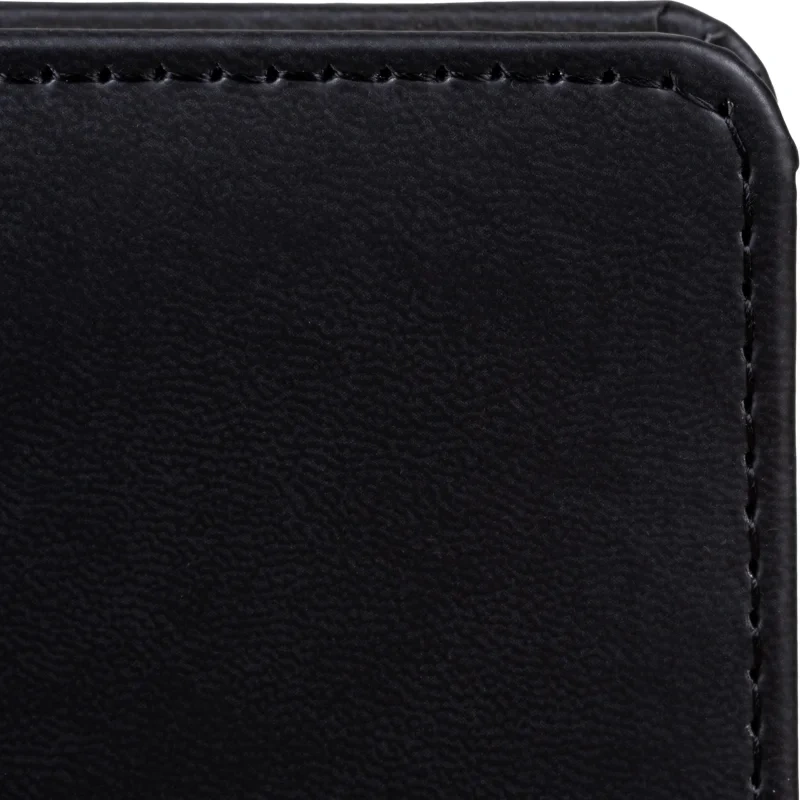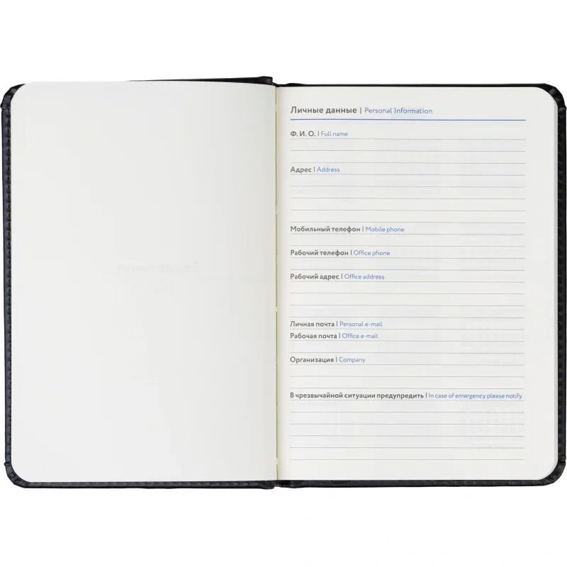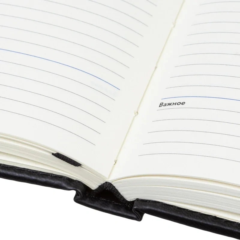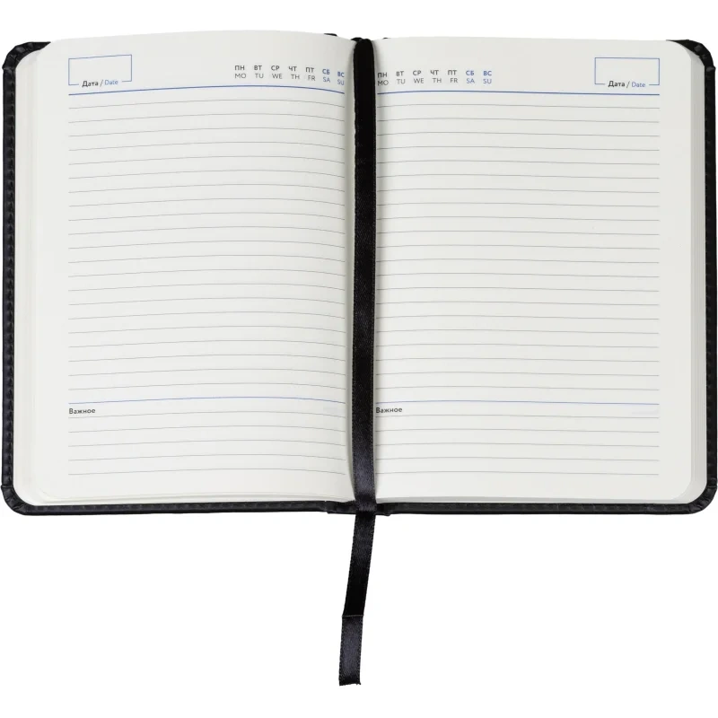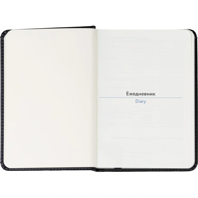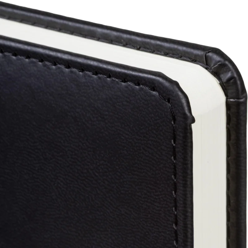 Обложка изготовлена из чёрной искусственной кожи с тиснением и прострочкой по периметру. Твёрдый переплёт на сшивке обеспечивает долговечность, а скруглённые углы и вырубка блока делают ежедневник удобным в использовании. Встроенное ляссе позволяет быстро находить нужную страницу. Внутри расположен календарь на два года. Изделие подходит для персонализации.