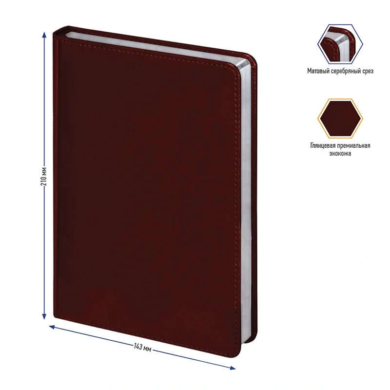 Обложка выполнена из коричневой искусственной кожи с тиснением и аккуратной прострочкой по периметру. Твёрдый переплёт на сшивке обеспечивает надёжность, а скруглённые углы и вырубка блока повышают удобство при использовании. Ежедневник дополнен ляссе для быстрого поиска нужной страницы и календарём на два года. Подходит под персонализацию.