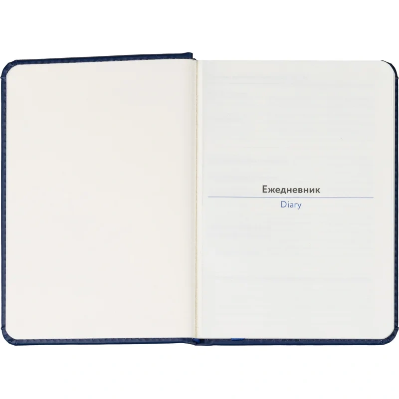 Обложка выполнена из искусственной кожи синего цвета, украшена тиснением и прошита по периметру, благодаря чему изделие выглядит аккуратно и выдержанно. Скруглённые углы листов и вырубка блока повышают комфорт при использовании. Ежедневник дополнен ляссе и календарём на два года. Крепление блока — сшивка, обеспечивающая надёжность при частом открывании.