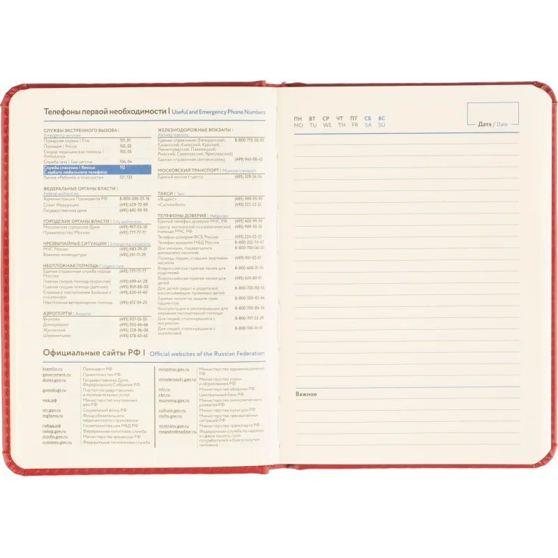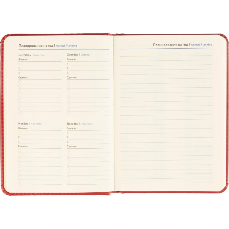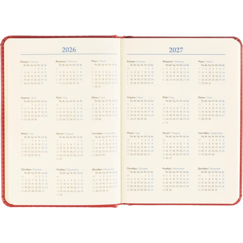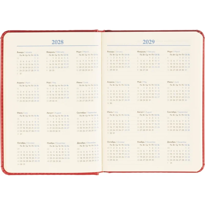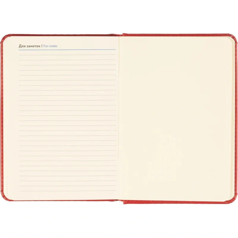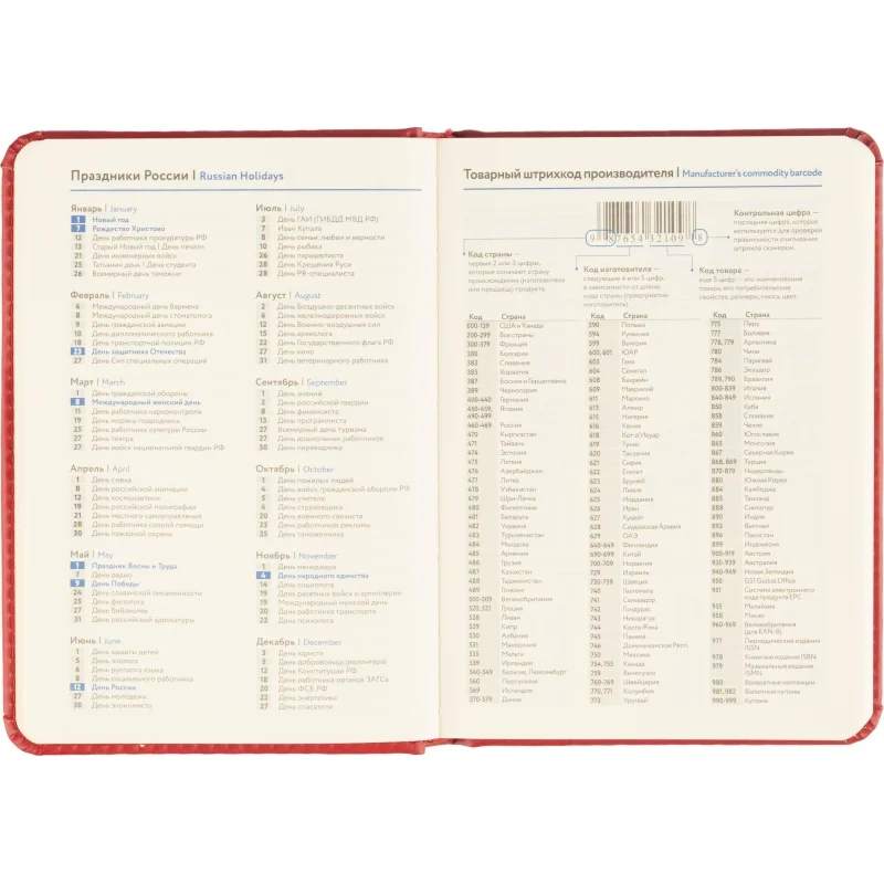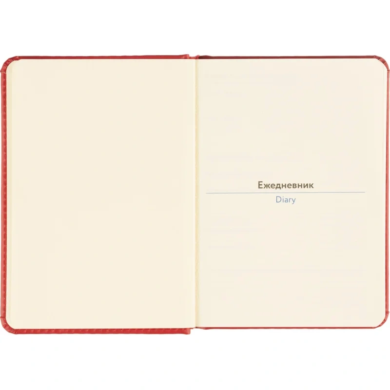 Обложка выполнена из красной искусственной кожи с тиснением и прострочкой по периметру. Твёрдая конструкция и сшивной переплёт обеспечивают надёжность и долговечность. Скруглённые углы листов и вырубка блока делают использование комфортным. Ежедневник оснащён ляссе и содержит календарь на два года. Подходит под персонализацию.