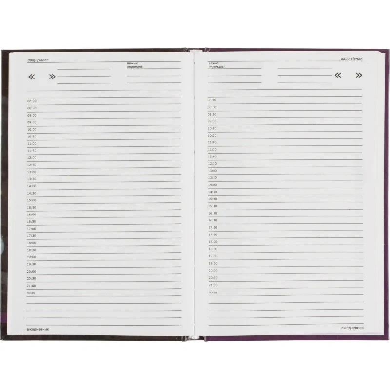 Внутренний блок включает 128 листов (256 страниц) белой офсетной бумаги плотностью до 65 г/кв.м. Разметка выполнена в линейку, каждая страница предназначена для одного дня недели с временным интервалом с 8:00 до 21:00 и дополнительными свободными строками. Печать выполнена в одну краску.