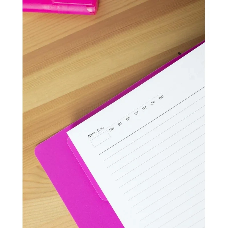 Внутренний блок содержит 136 листов высококачественной белой офсетной бумаги с 100% белизной и плотностью 70-90 г/кв.м. Листовка оформлена в линейку, печать выполнена в один цвет. В комплект входит съёмный пластиковый разделитель для удобства организации записей.