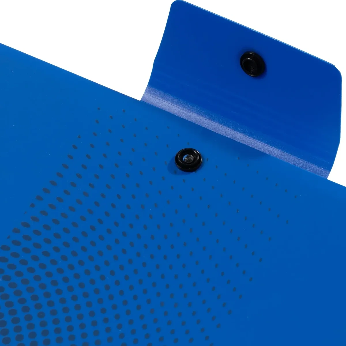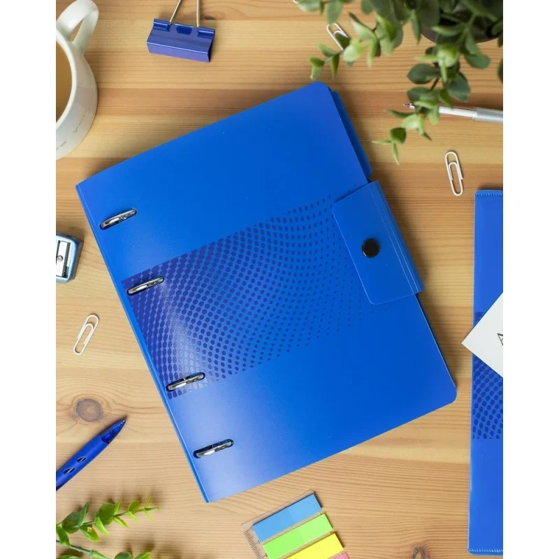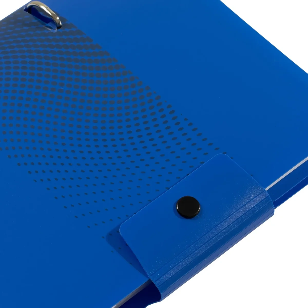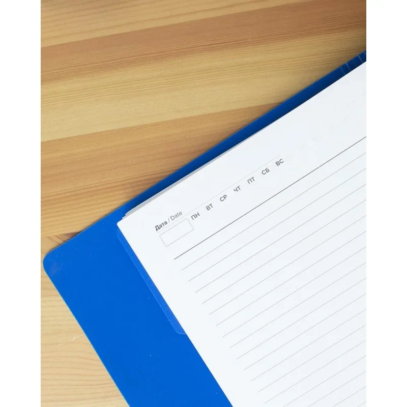 Ежедневник выполнен в синем цвете и оснащён кольцевым механизмом, обеспечивающим удобный переворот страниц. Обложка изготовлена из плотного пластика с приятной тактильной поверхностью и закрывается на кнопку.