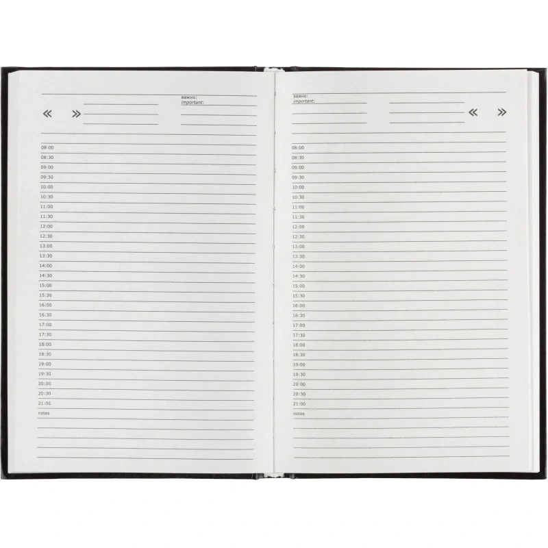 Ежедневник недатированный Attache Economy,бумвин.,черный,А5,128х200мм,160л Ежедневник недатированный Attache Economy. Размер блока: 128x200 мм, размер изделия: 134x206 мм. Обложка твердый картон в бумвиниле - современный переплетный материал на бумажной основе. Цвет обложки черный. Стиль обложки универсальный, офисный. Возможно тиснение фольгой. Прошитый тип крепления надежно держит блок. Блок: 160 листов (320 страниц), бумага белый офсет, плотностью 55-55-65 г/кв.м., белизной 70%, печать в блоке в 1 краску. Цвет обреза белый. Содержит информационно-справочный блок - личные данные, телефонные коды России, международные телефонные коды, европейские аэропорты, телефонные коды СНГ и Балтии, номера телефонов в Москве, автомобильные коды регионов России, российские государственные праздники, размеры одежды, штриховой код, единицы измерения, список стран мира, телефонную книгу, внутренний календарь на 2023 - 2026 гг. На один день недели приходится одна страница, временной интервал - 30 минут с 8:00 до 21:00 свободные строки. Нет петли для ручки. Удобен для записи переговоров, встреч.Тиражи ежедневников напечатаны до изменения территории РФ.Товар относится к ценовому сегменту ''эконом''. Имеет базовые характеристики и более простую упаковку. Отвечает основным требованиям потребления.Законодательные и технические документы: