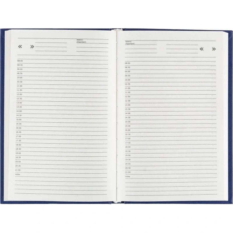Ежедневник предназначен для систематизации деловых записей и планирования встреч в офисной среде. Изделие выполнено в вертикальной ориентации и имеет размер 134×206 мм, что соответствует формату А5. Блок включает 160 листов из белой офсетной бумаги плотностью 65 г/кв.м с белизной 70%. Каждая страница содержит разметку в линейку и предназначена для одного дня недели, с временным интервалом 30 минут с 8:00 до 21:00. Это делает ежедневник удобным для записи переговоров и деловых встреч.