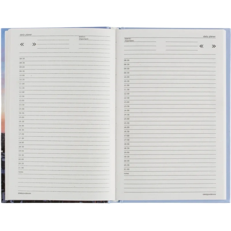 На один день недели приходится одна страница с временным интервалом 30 минут с 8:00 до 21:00, предусмотрены свободные строки для заметок. Ежедневник удобен для записи переговоров и встреч.