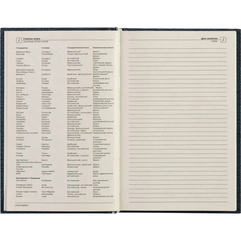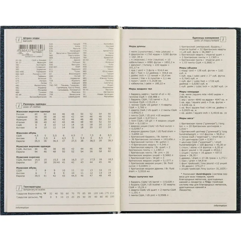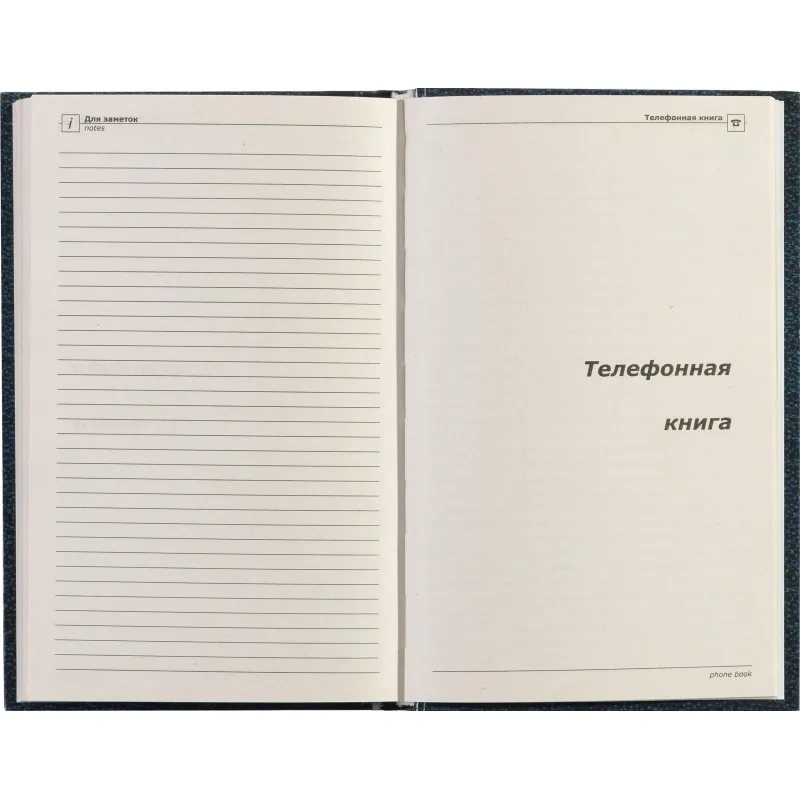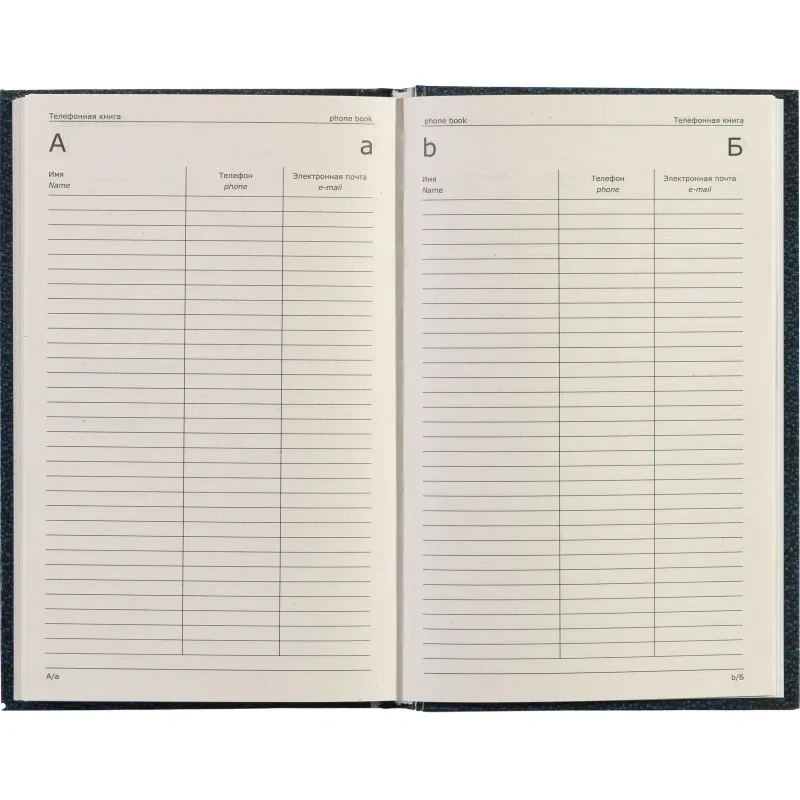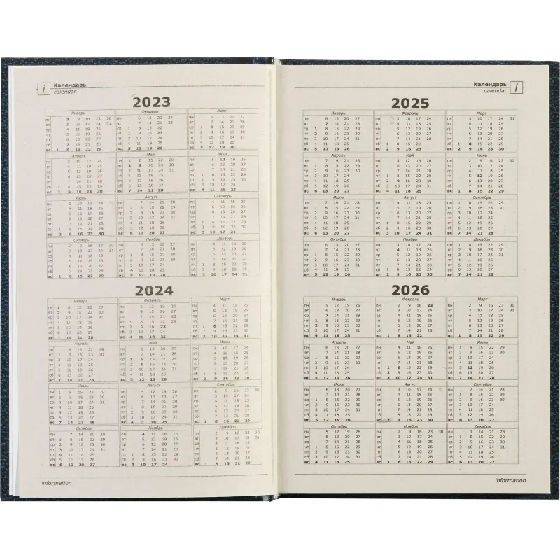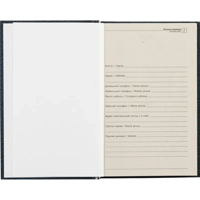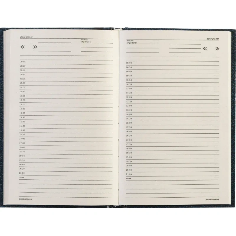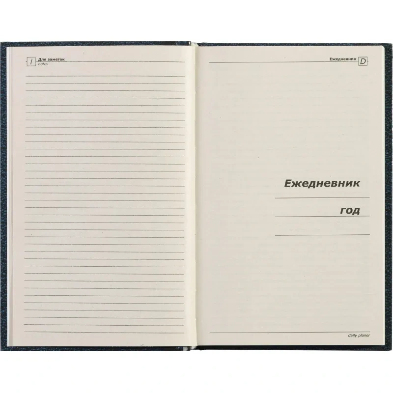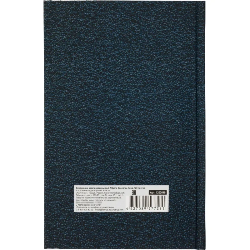 Ежедневник недатированный Attache Economy 7БЦ A5 128 листов синийЕжедневник с универсальным офисным дизайном выполнен с твёрдой обложкой из цветного картона с глянцевой ламинацией. Размер изделия - 134x206 мм, размер блока - 128x200 мм. Крепление блока - прошитое, обеспечивает надёжность и долговечность.Внутренний блок состоит из 128 листов (256 страниц) белой офсетной бумаги плотностью 55-65 г/кв.м. и белизной 70%. Страницы имеют линовку в виде линейки, печать выполнена в одной краске. На один день недели приходится одна страница с временными интервалами по 30 минут с 8:00 до 21:00, предусмотрены свободные строки для заметок. Ежедневник удобен для записи переговоров и встреч.Информационно-справочный блок включает личные данные, телефонные коды России и международные, коды городов СНГ и Балтии, номера телефонов служб Москвы, автомобильные коды регионов России, российские государственные праздники, размеры одежды, штриховой код, единицы измерения, а также список стран мира с указанием столицы, государственного языка и национальной валюты. Календарь рассчитан на 4 года.Обложка однотонная, с вертикальной ориентацией, без цветного обреза и вырубки блока. Изделие произведено в России.