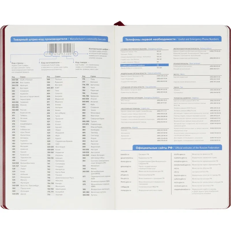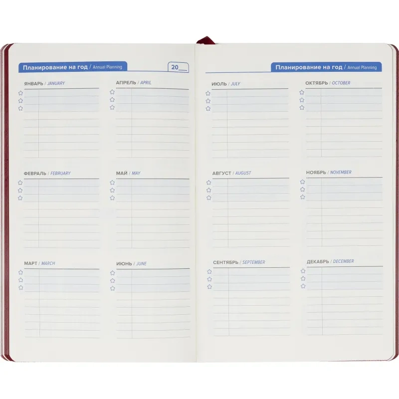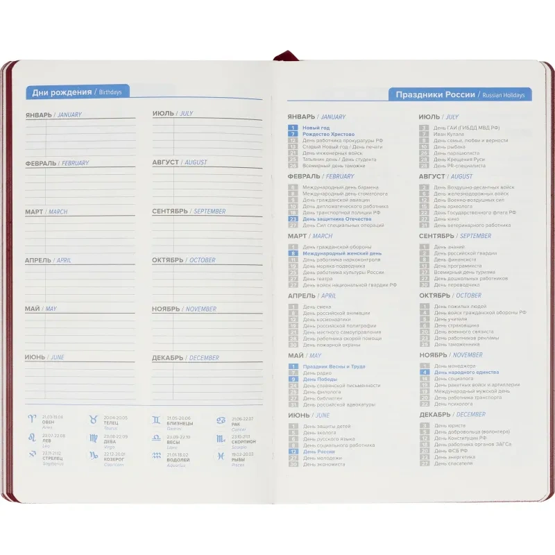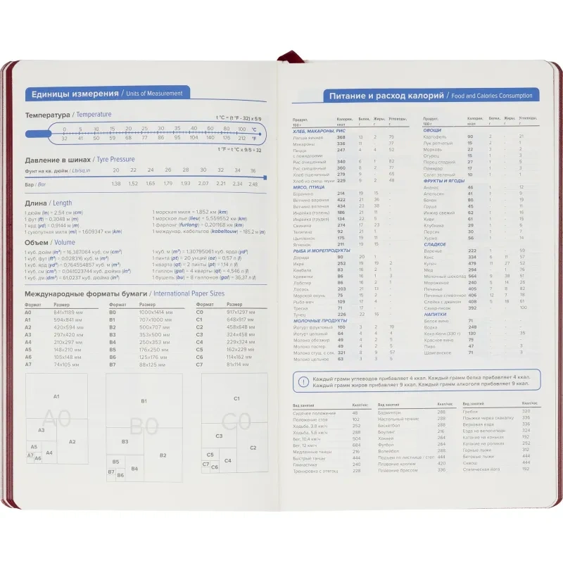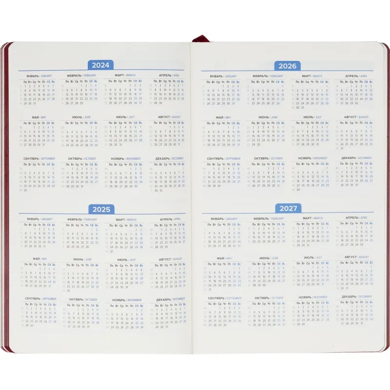 Недатированный ежедневник формата A5 предназначен для планирования, записи идей и хранения полезной справочной информации. Размер 130×210 мм позволяет разместить все необходимые заметки, оставаясь при этом компактным для переноски. Внутренний блок включает 272 страницы, напечатанные в две краски на офсетной бумаге плотностью 70 г/кв.м. Разметка выполнена в линейку. Цвет бумаги — бежевый. Блок дополнен календарём на 2024–2027 годы и включает справочный раздел с информацией о государственных праздниках, единицах измерения, калорийности продуктов, телефонах экстренных служб, официальных интернет-ресурсах и товарных штрих-кодах.
