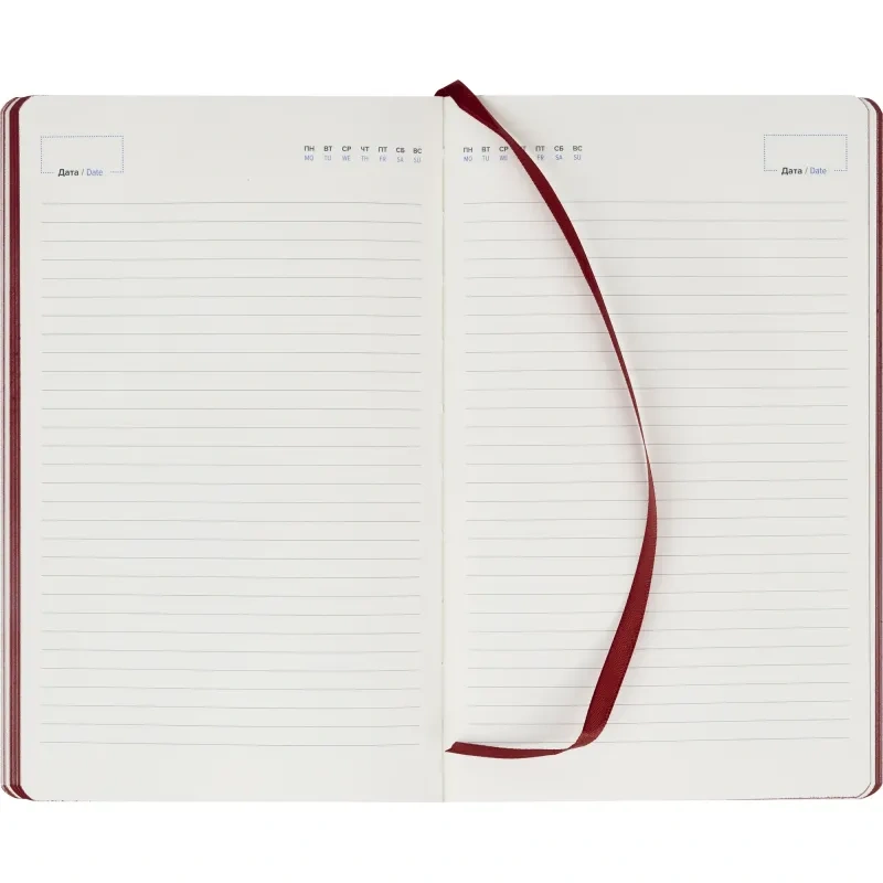 Обложка выполнена из искусственной кожи с покрытием Soft Touch, оформлена в бордовом цвете в выразительном, эмоциональном стиле. Мягкая конструкция удобна в повседневном использовании, при этом сшивка обеспечивает надёжность крепления листов. В ежедневник встроено бордовое ляссе и цветной обрез в тон обложке. Предусмотрена вырубка блока и карман для хранения небольших бумаг. Скруглённые углы листов способствуют комфортному использованию. Фиксирующая резинка удерживает изделие в закрытом виде.