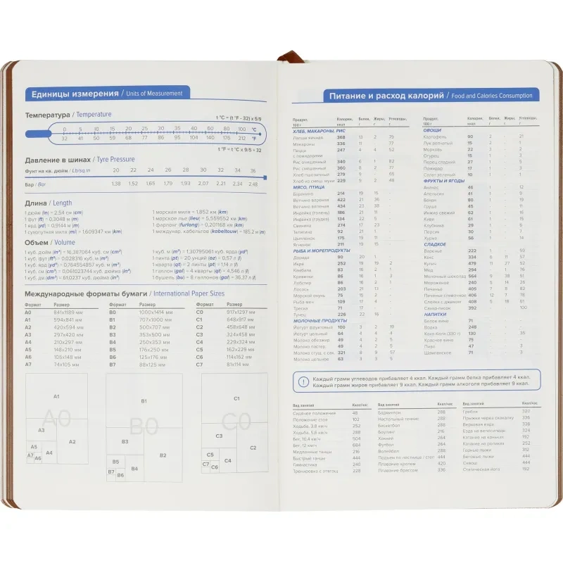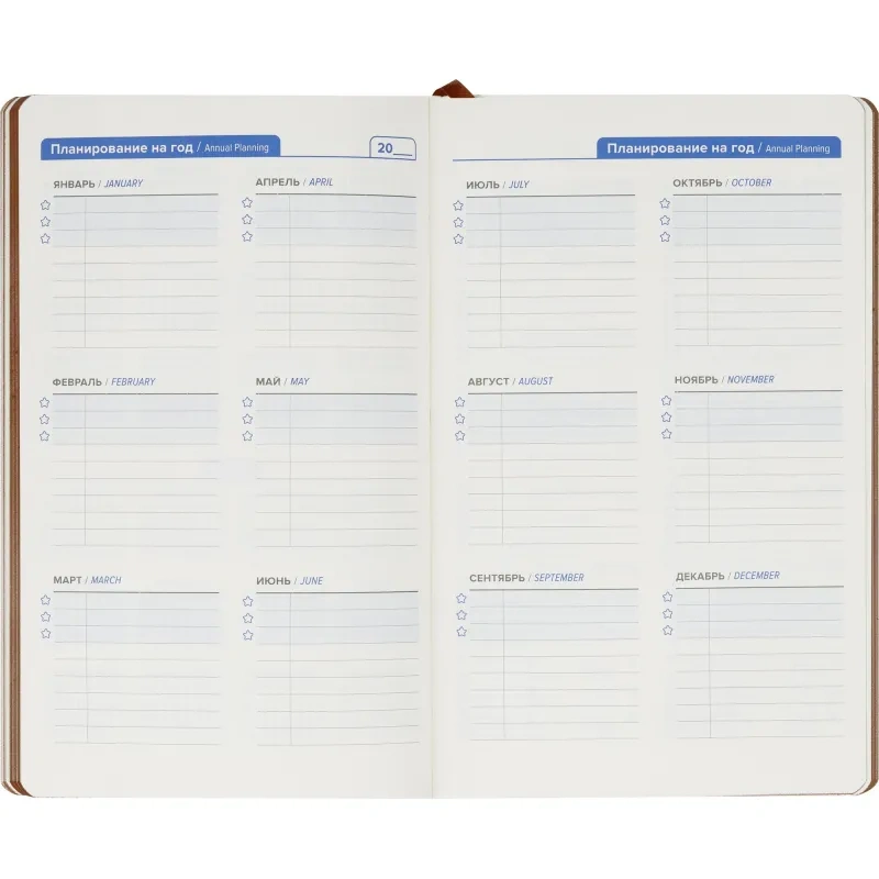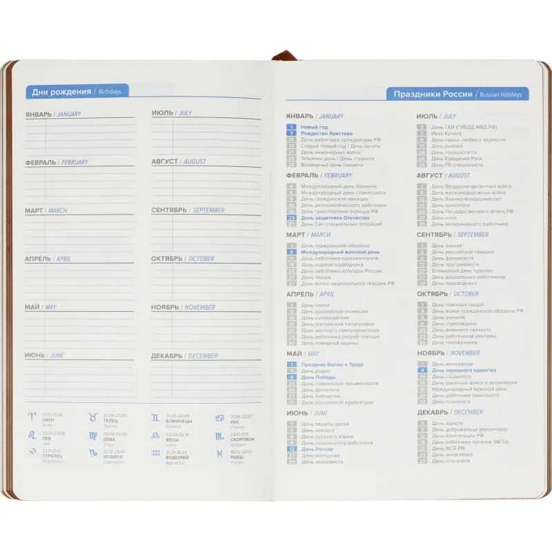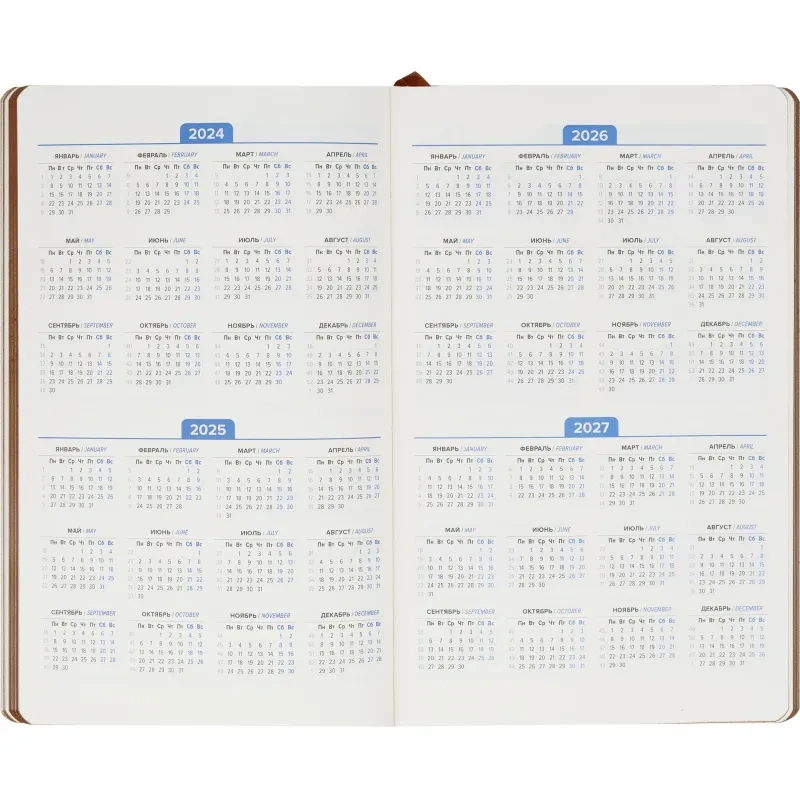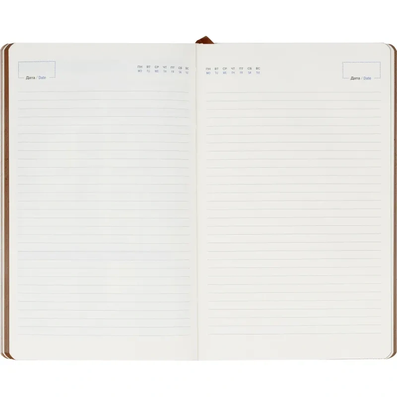 Недатированный ежедневник формата А5 размером 130×210 мм с мягкой обложкой из искусственной кожи коричневого цвета в универсальном офисном стиле. Внутренний блок содержит 272 страницы офсетной бумаги плотностью 70 г/кв.м. с линейной разметкой и печатью в две краски. Бумага бежевого цвета, с цветным коричневым обрезом. Включён календарь на 2024–2027 годы и информационно-справочный блок с праздниками России, единицами измерения, питанием и расходом калорий, товарным штрих-кодом производителя, телефонами первой необходимости и официальными сайтами РФ.
